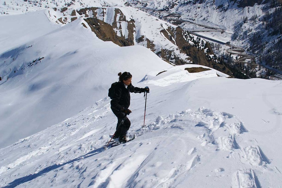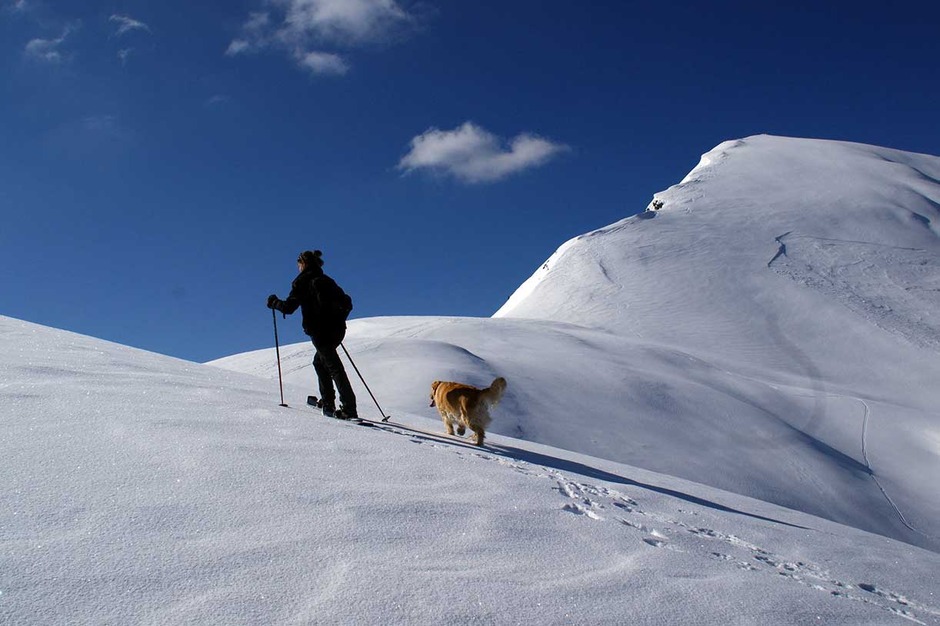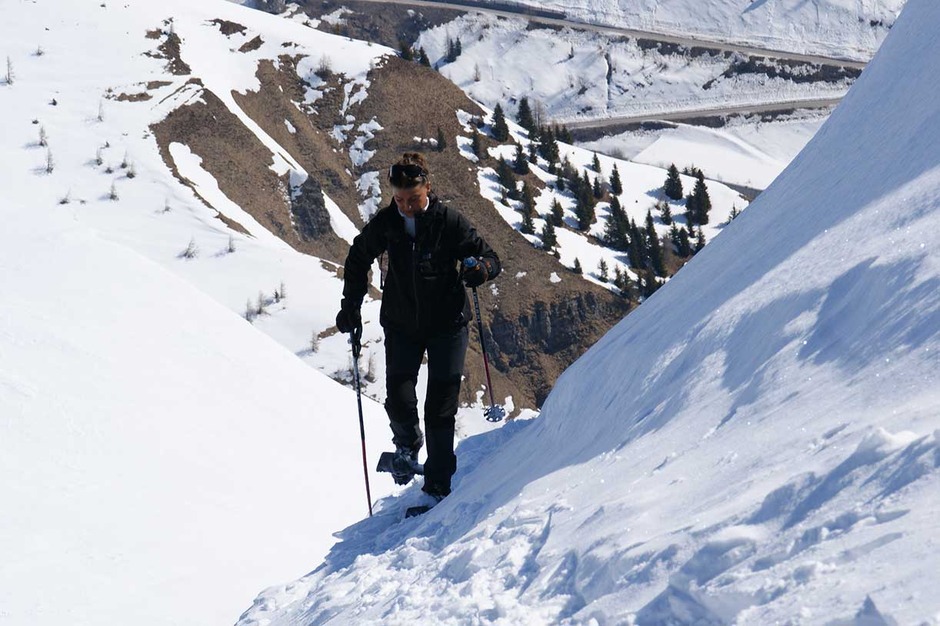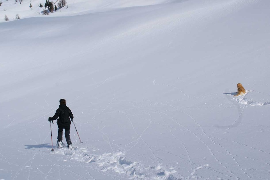 L'itineraio della ciaspolata prosegue lungo la dorsale nord-est, facendo attenzione a non sporgersi troppo verso la parete verticale sud, dove ci possono essere delle creste di neve pericolose.