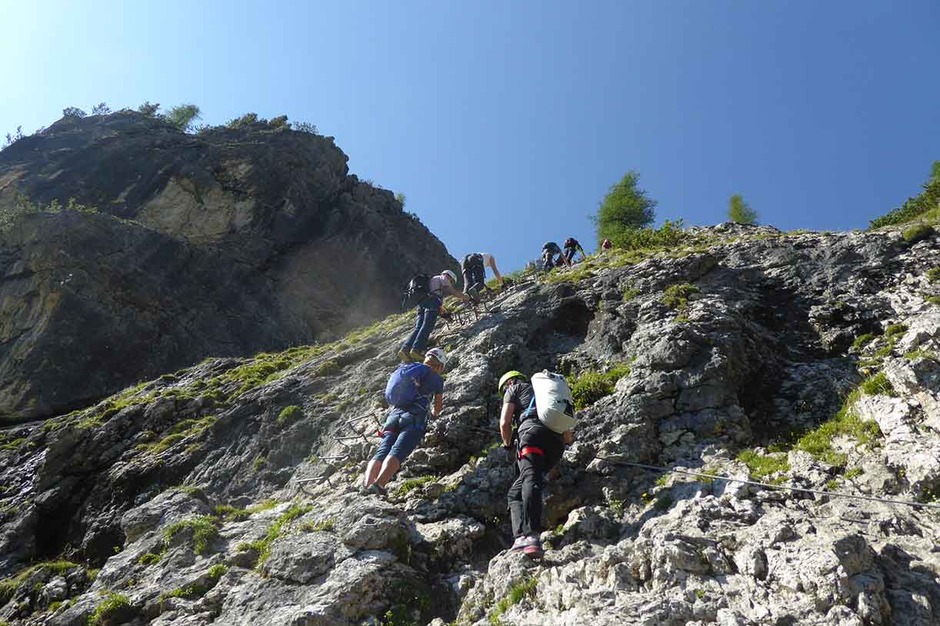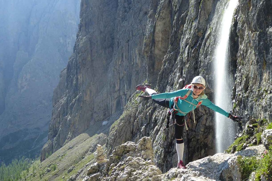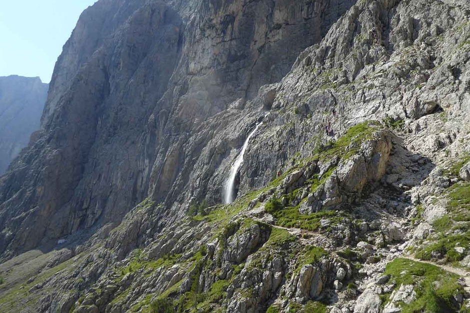 Si attacca una prima parete che porta ad una grande cengia che offre un'eventuale via di uscita dalla ferrata. Si prosegue quindi per pareti verticali su bella roccia fino ad un secondo grande terrazzo da dove si può ammirate la bella cascata d'acqua.