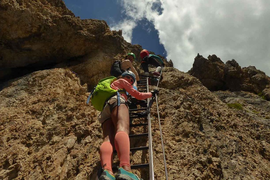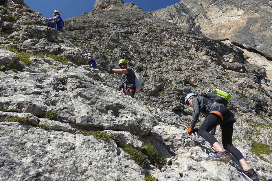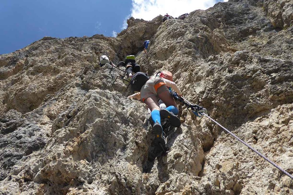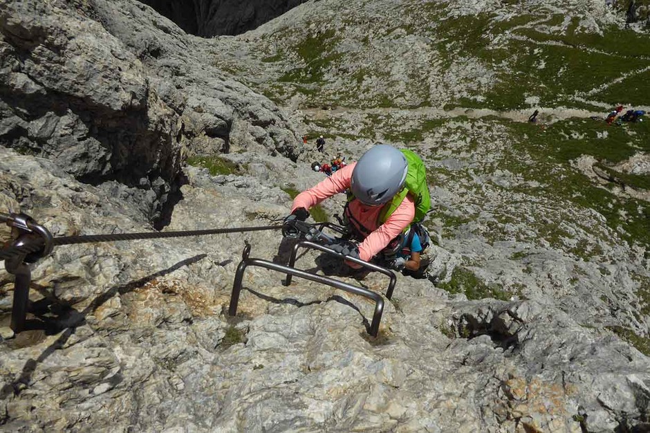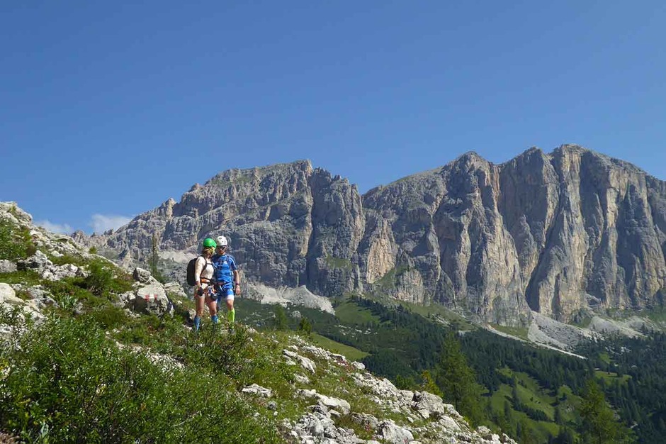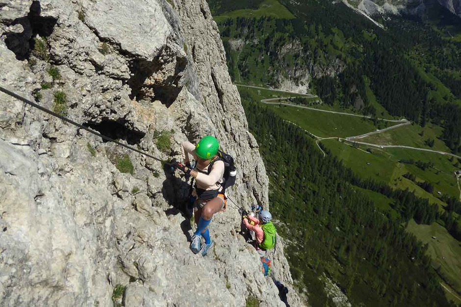 Dal grande parcheggio appena sotto il passo Gardena si segue il sentiero che porta all'attacco della via ferrata che si raggiunge in soli 10 minuti.
