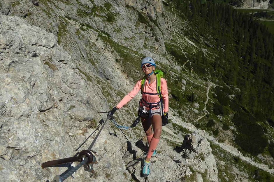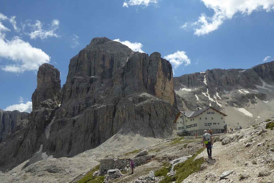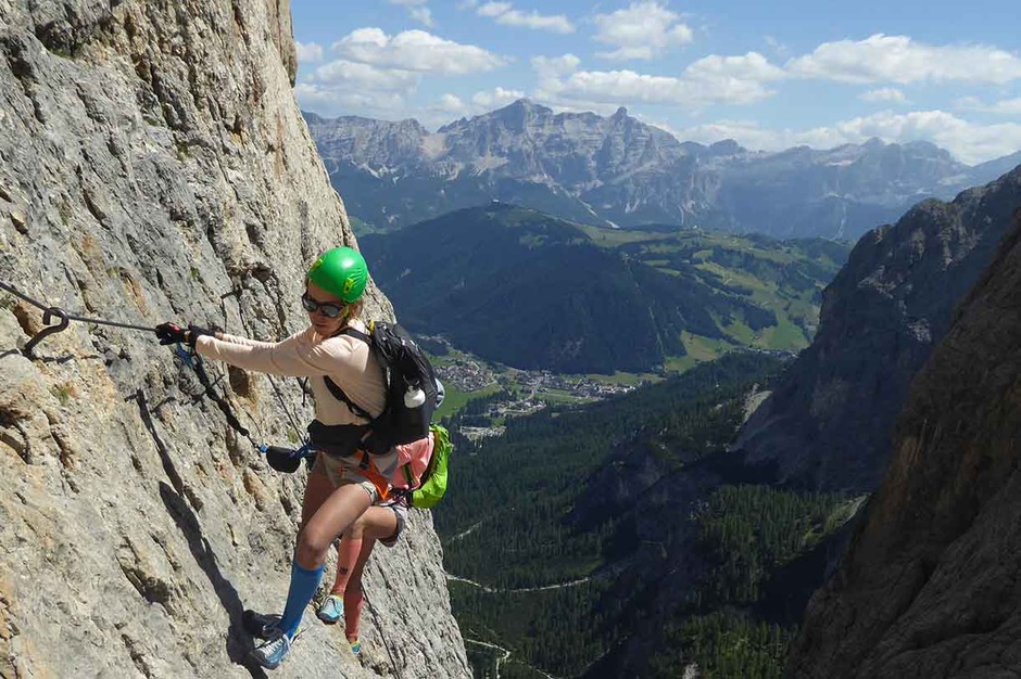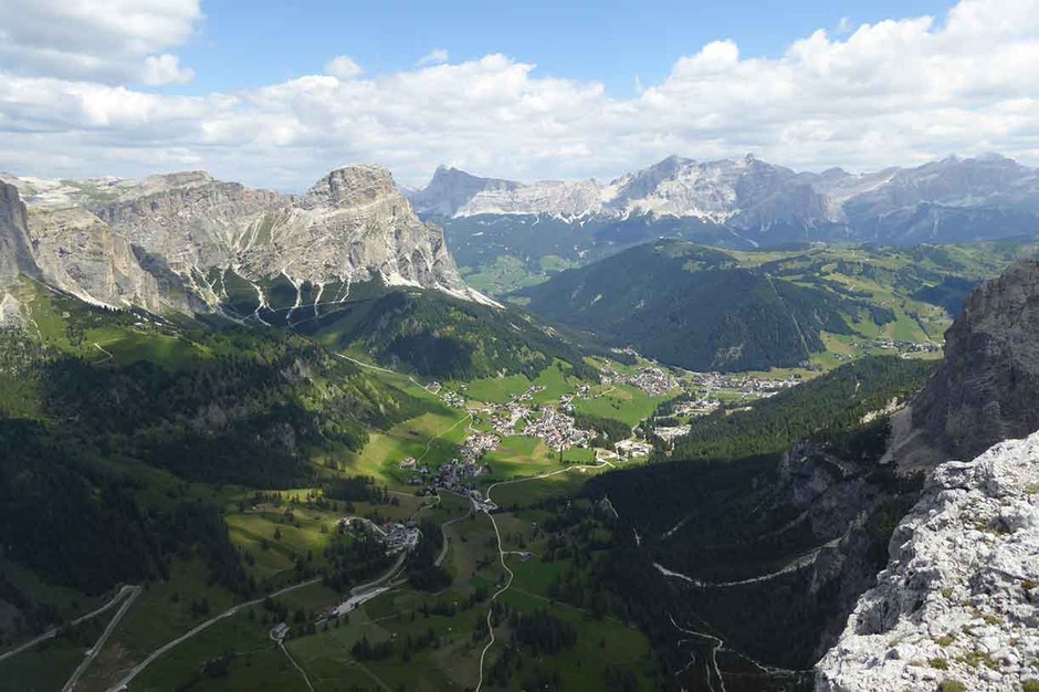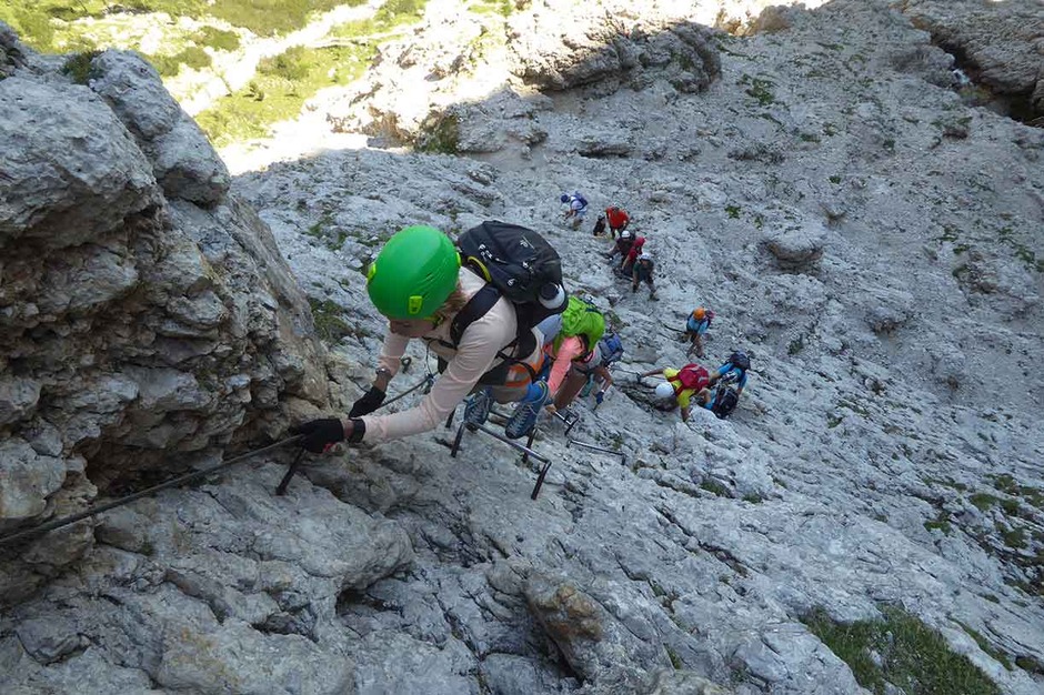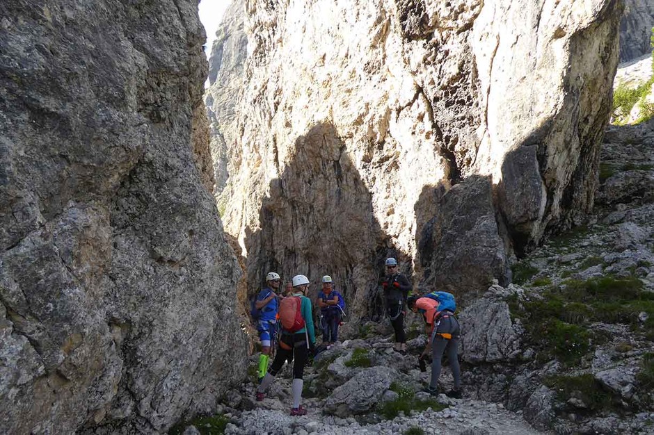 Dal grande parcheggio appena sotto il passo Gardena si segue il sentiero che porta all'attacco della via ferrata che si raggiunge in soli 10 minuti.