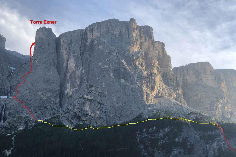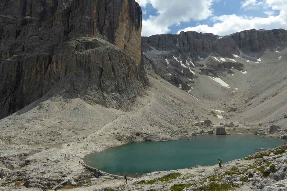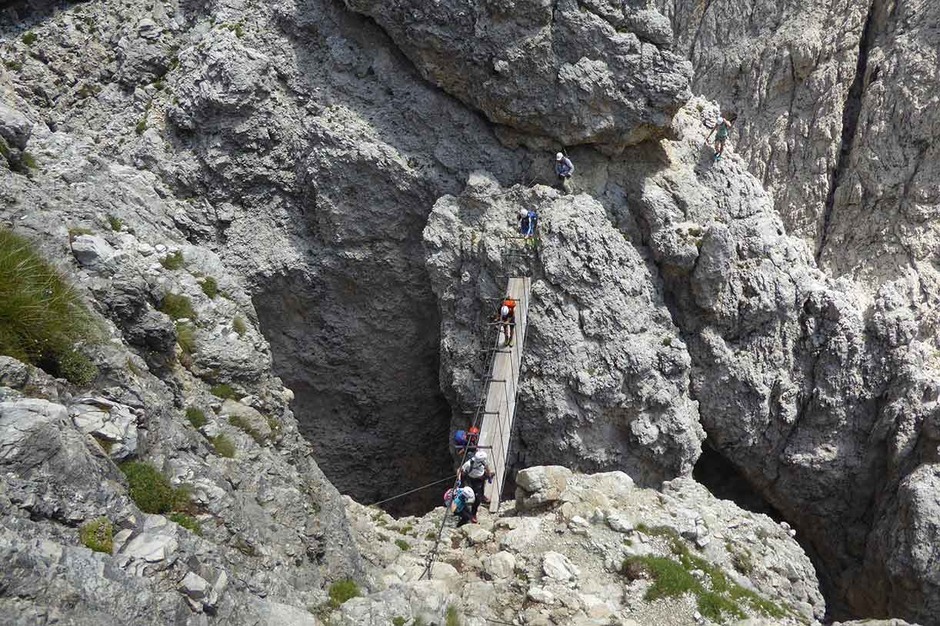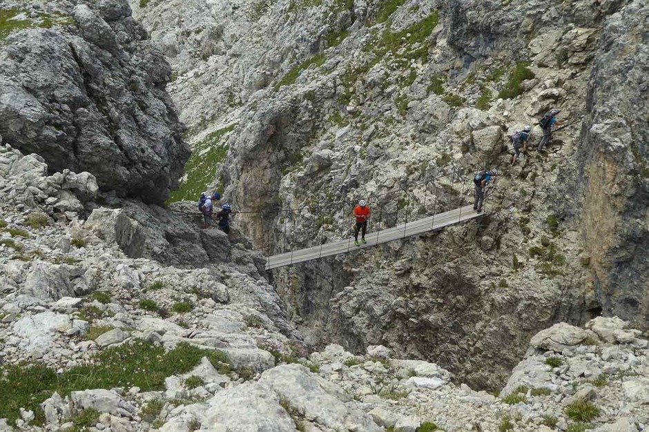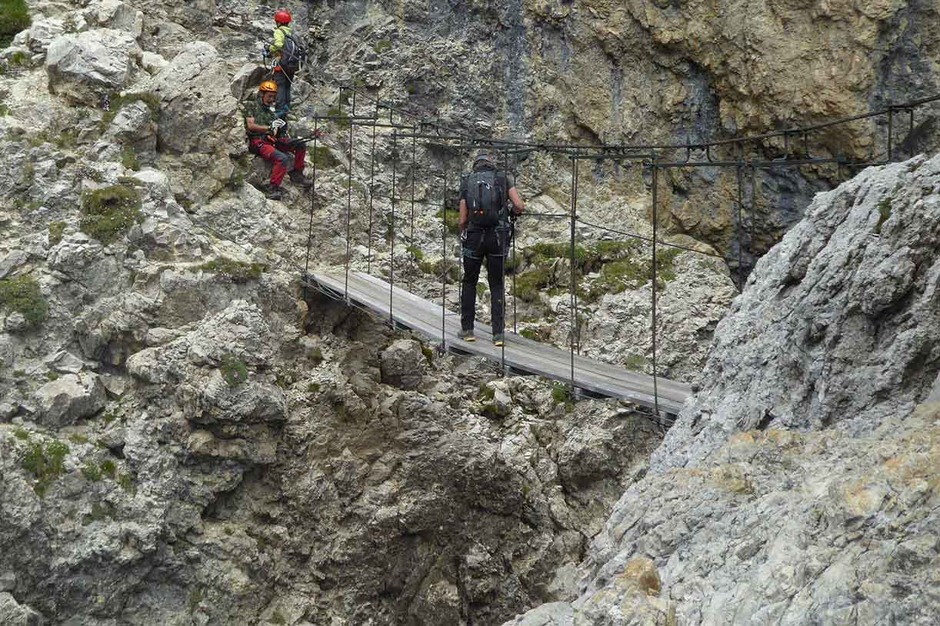 Il terzo tratto della Ferrata Tridentina sale, sempre verticale, utilizzando scalette e pioli in ferro, soprattutto in prossimità della Torre Exner, dove si trova il caratteristico ponte sospeso. In 15 minuti si raggiunge seguendo un comodo sentiero il rifugio Cavazza al Pisciadù a 2585 metri.