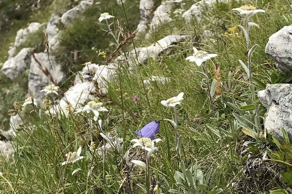 Su questa parete, lungo l'itinerario, si possono vedere un'infinità di stupende stelle alpine.