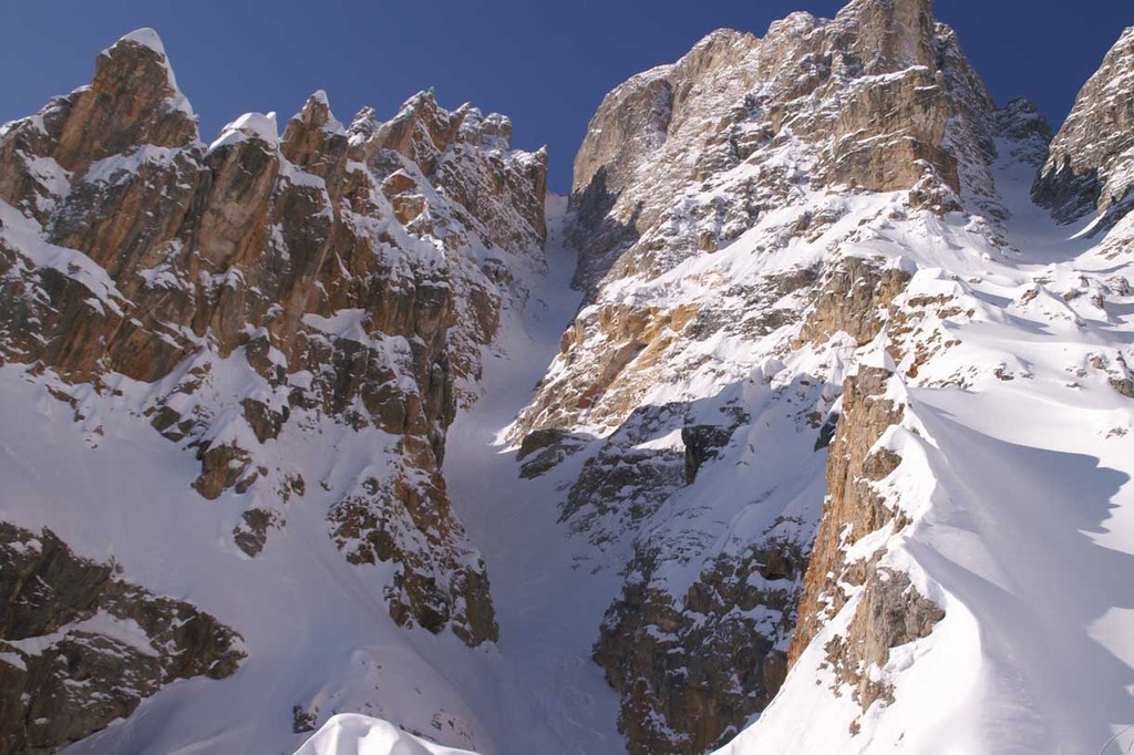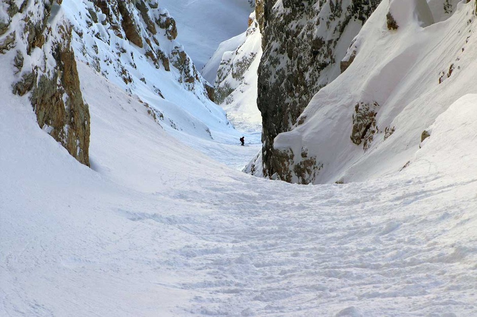 La parte finale del canale è meno ripida e sbocca sui fantastici pendii della Val Fonda per concludere una discesa memorabile.