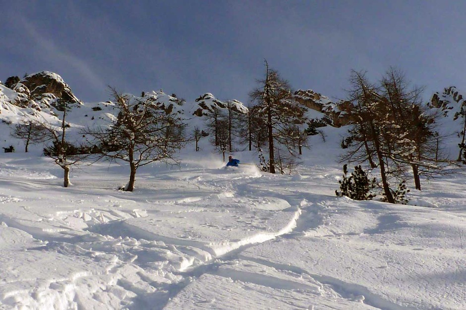 La partenza si presenta un po' stretta, ma superato questo breve tratto, il pendio si allarga regalando una sciata bella e divertente.