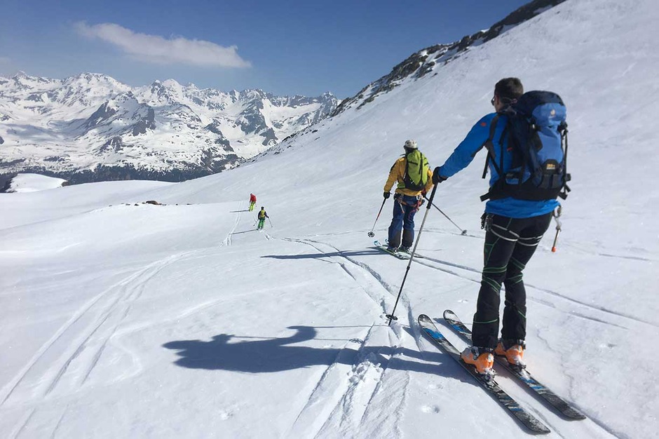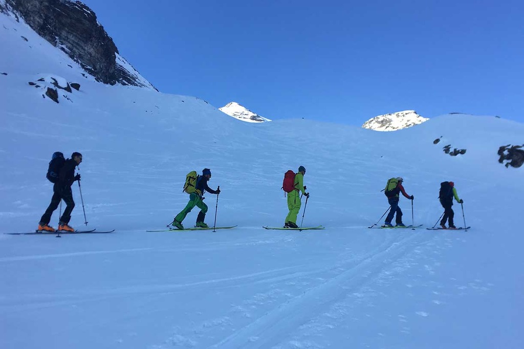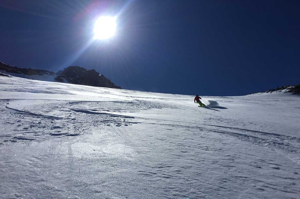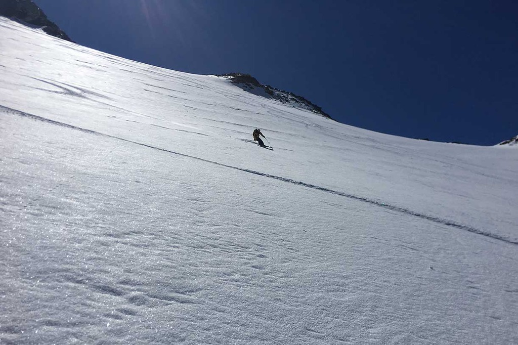 La discesa offre due possibilità: la prima scendendo per l'itinerario di salita; la seconda scendendo lungo i bellissimi pendii del vallone più a sinistra, fino ad un piccolo lago alpino, dove si rimettono le pelli per 10 minuti per risalire una piccola dorsale che ci riporta sulla traccia di salita.