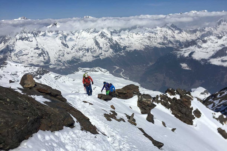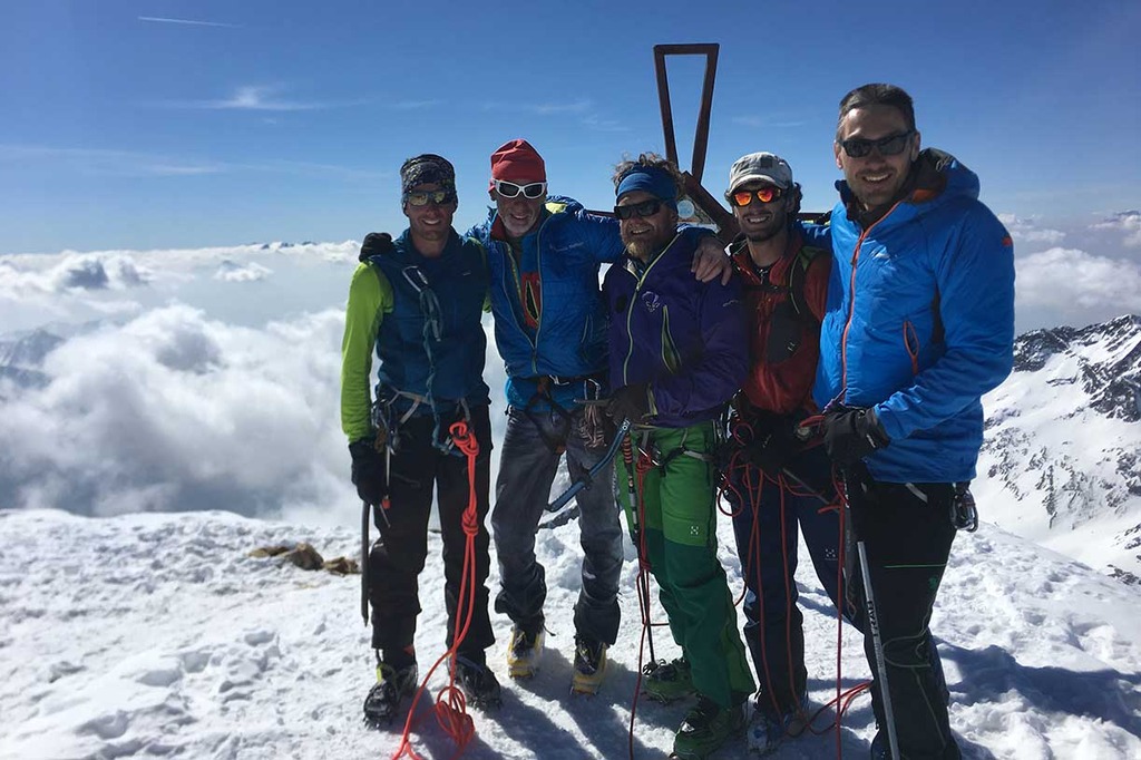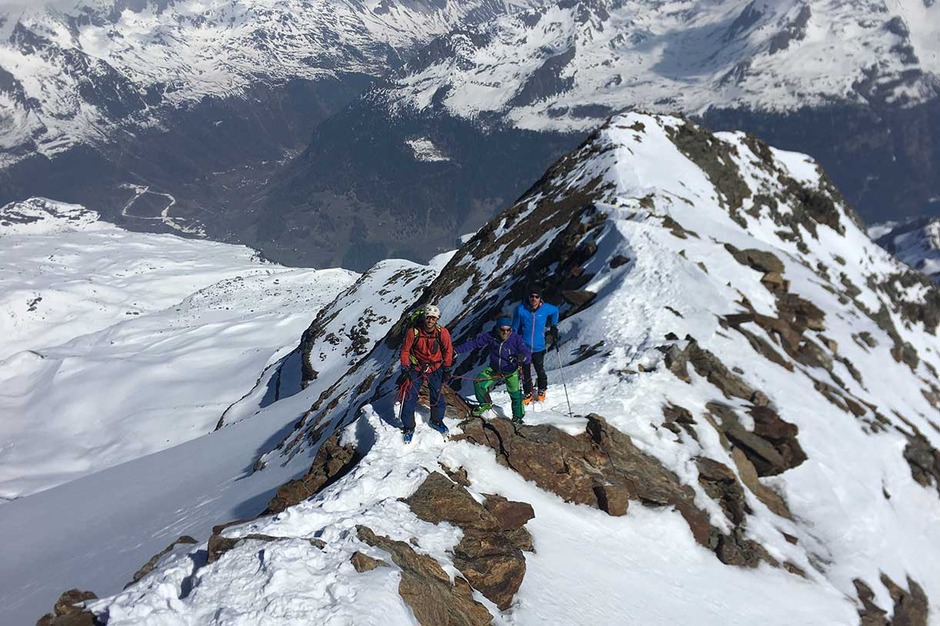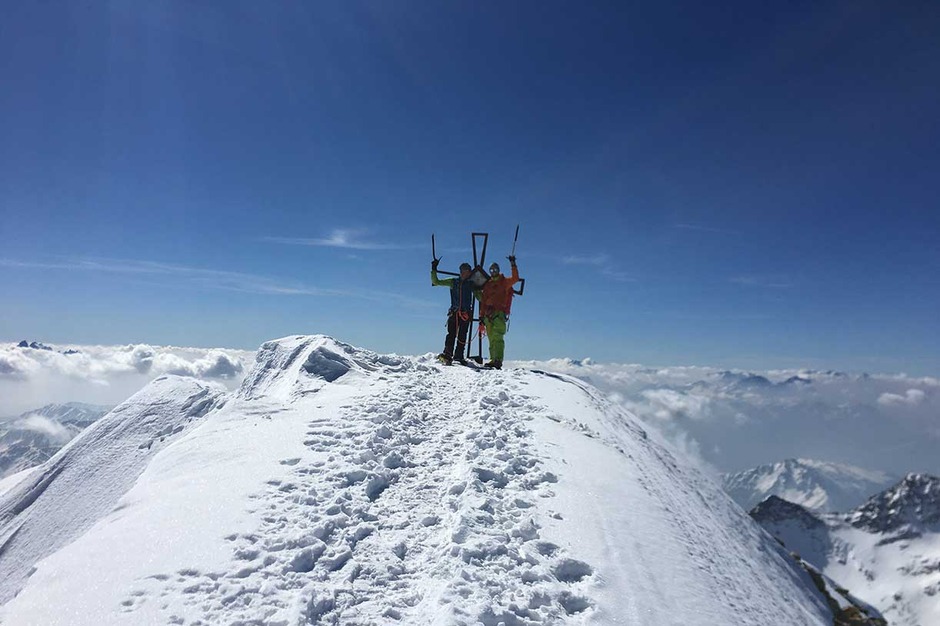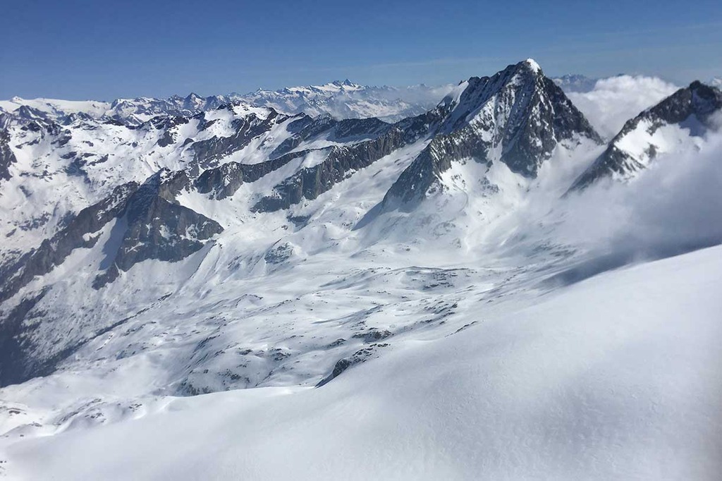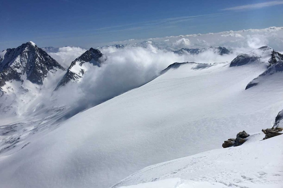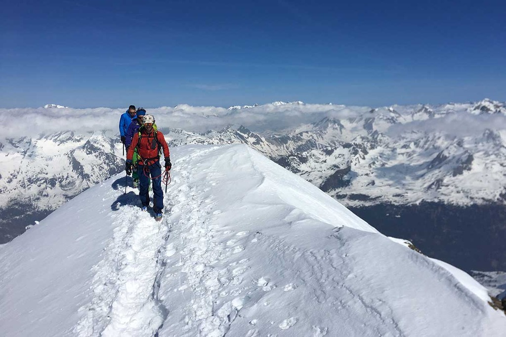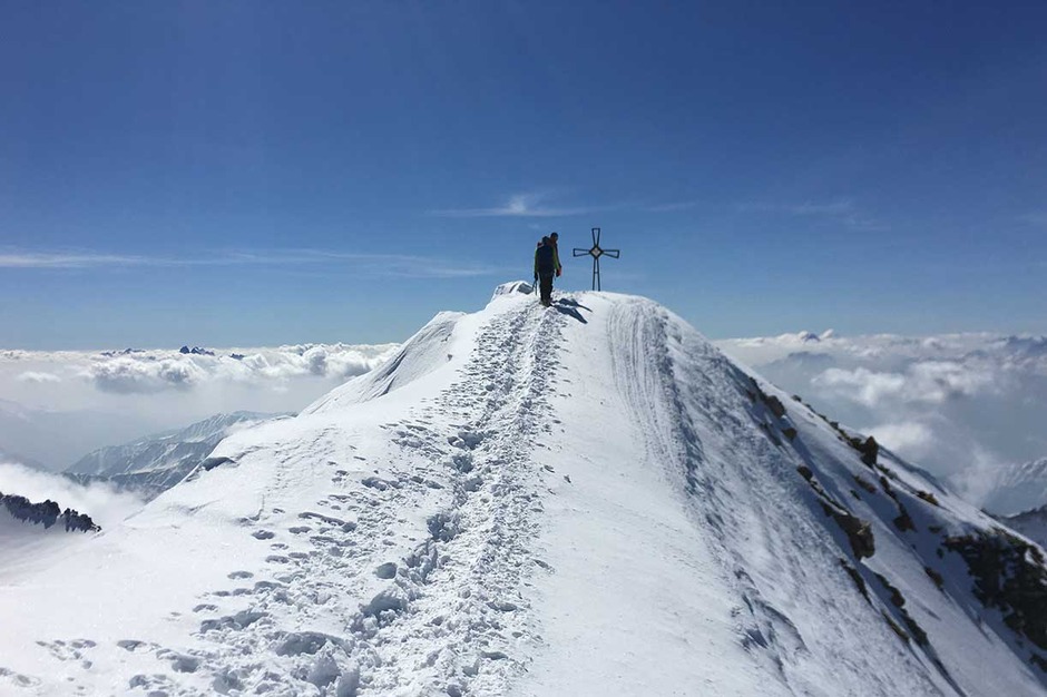 Entrati nell'evidente grande vallone del Monte Nevoso, si sale fino alla prima cresta rocciosa, sulla destra, che porta sotto la dorsale della cima. Calzati i ramponi, si prosegue per tratti rocciosi fino alla croce di vetta a 3358 metri, da dove si può vedere un grandioso panorama.