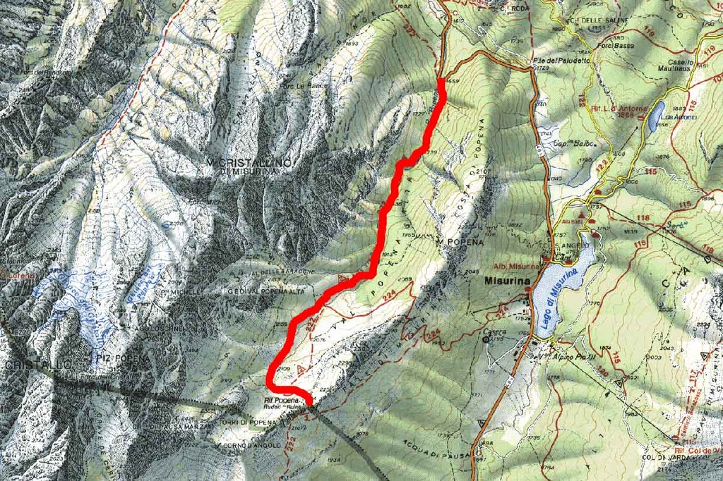 Dal lago di Misurina in auto si imbocca la strada statale che scende verso Carbonin. Arrivati in prossimità di un tornante si lascia la macchine in un piccolo parcheggio. Attraversato un piccolo ponte inizia l’escursione che sale lungo il torrente Popena.