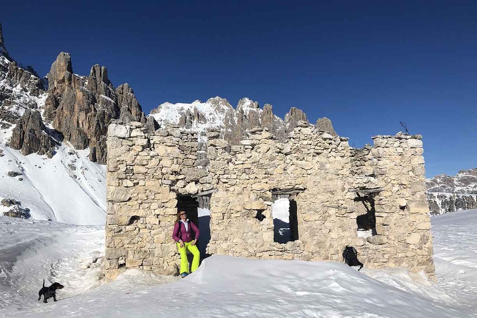 Finito il bosco, a 1900 metri si entra in un un grande vallone che termina sotto le pareti rocciose del Corno d’Angolo. Verso la fine di un lungo tratto pianeggiante si svolta a sinistra per arrivare sopra una dorsale dove ci trovano i ruderi del vecchio rifugio. È possibile con neve assestata proseguire dritti e salire sia sulla destra che sulla sinistra della grande torre del Corno d’Angolo.