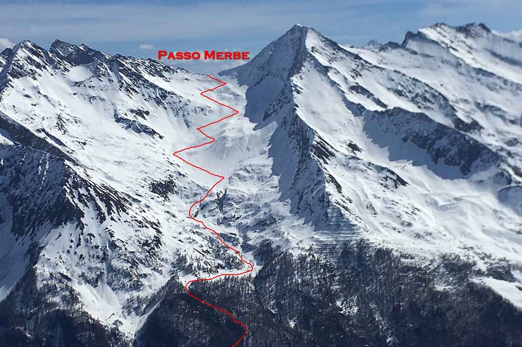 Si percorre quindi tutto il grande vallone ovest che porta alla forcella delle Merbe che divide la cima del Monte Pizzo Lungo, a destra, dalla cima della Punta Merbe a sinistra, entrambe di 3090 metri.