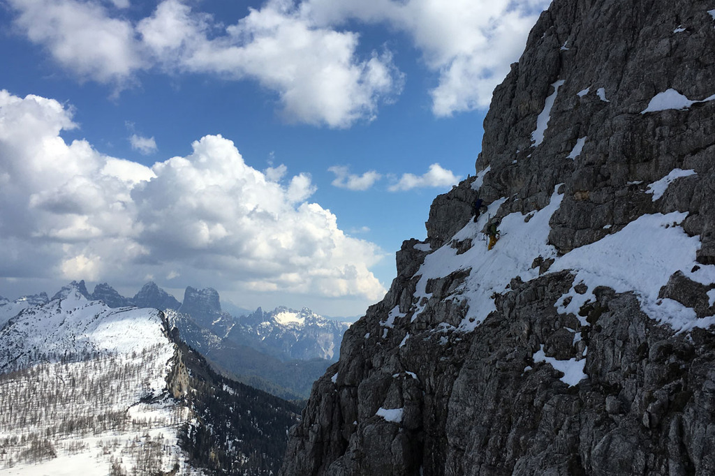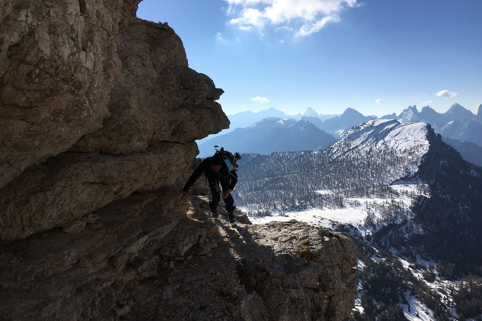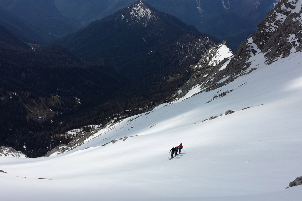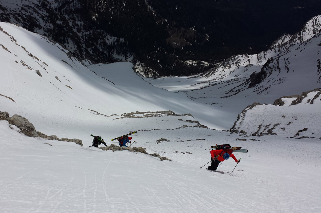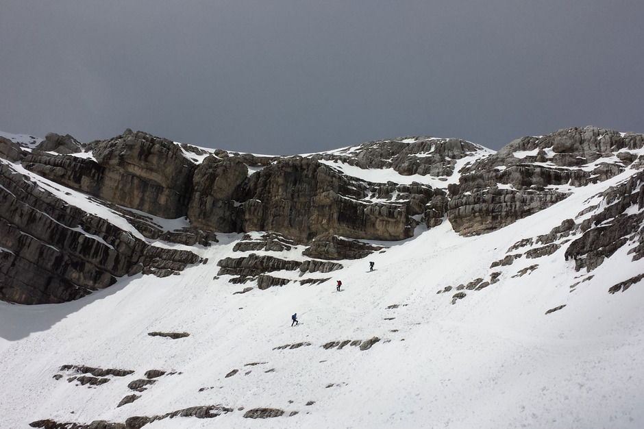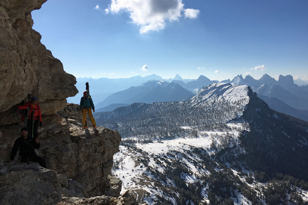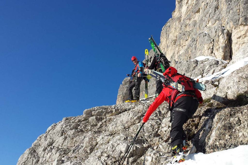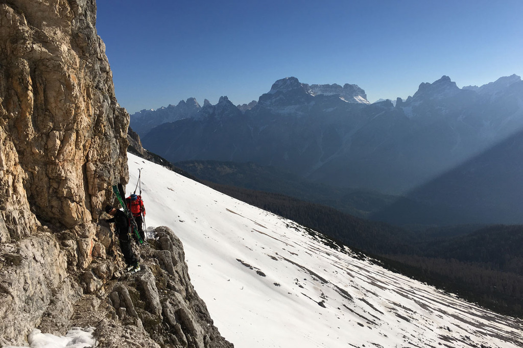La cengia, che si percorre con scarponi e sci sullo zaino, non va sottovalutata, si consiglia di procedere legati e di assicurarsi ai tanti chiodi che si trovano lungo il percorso.