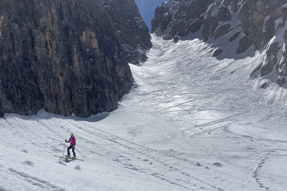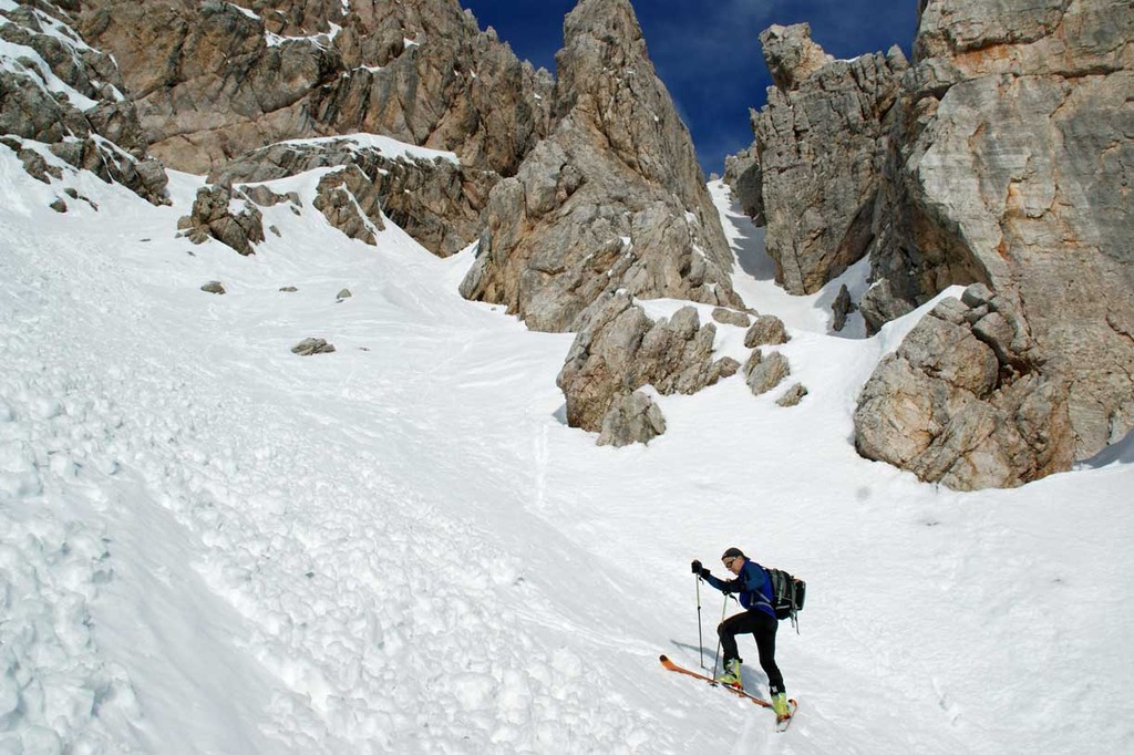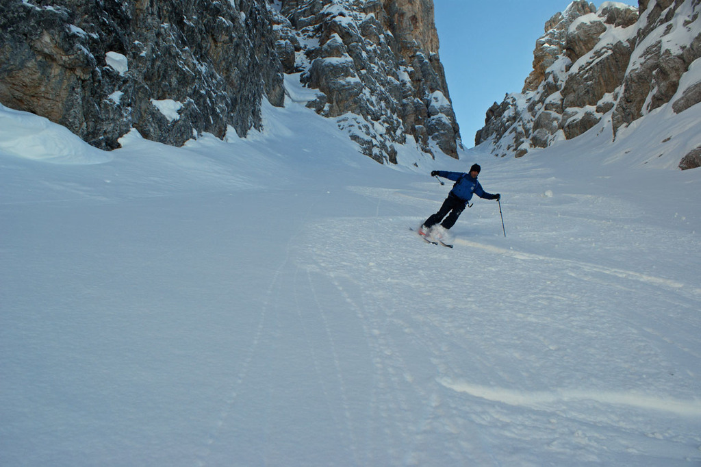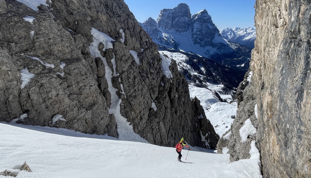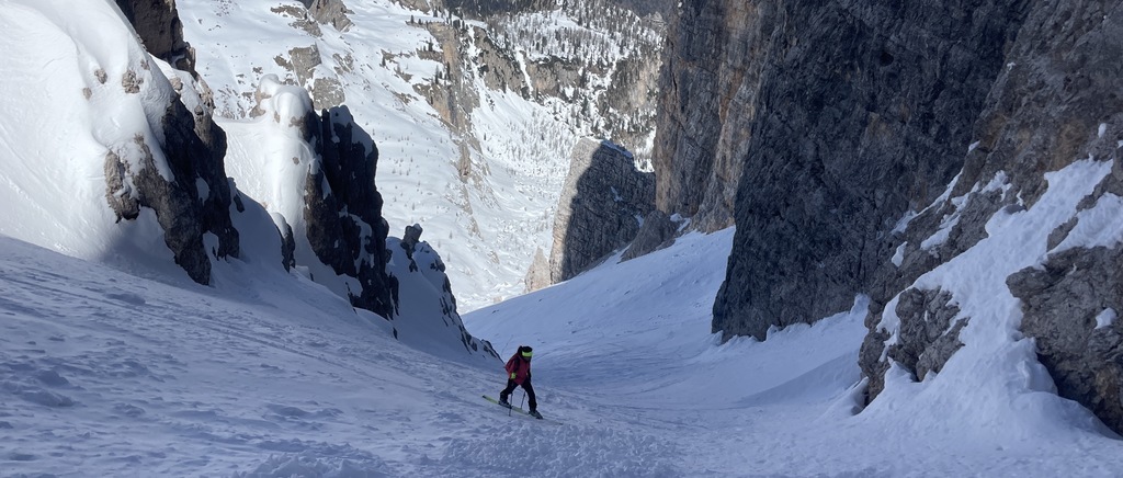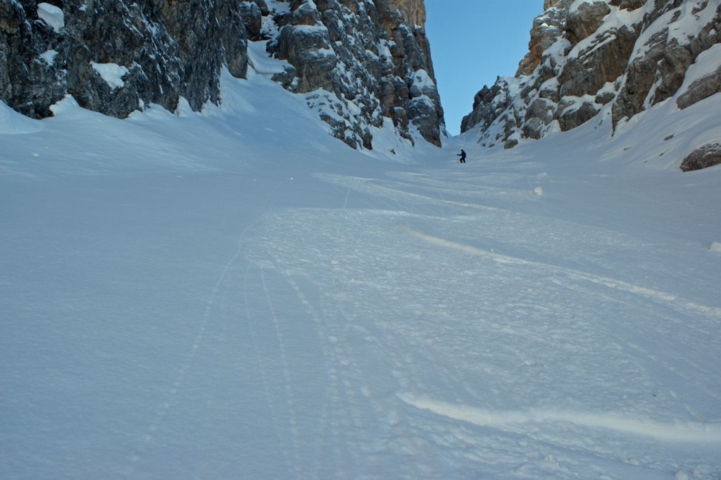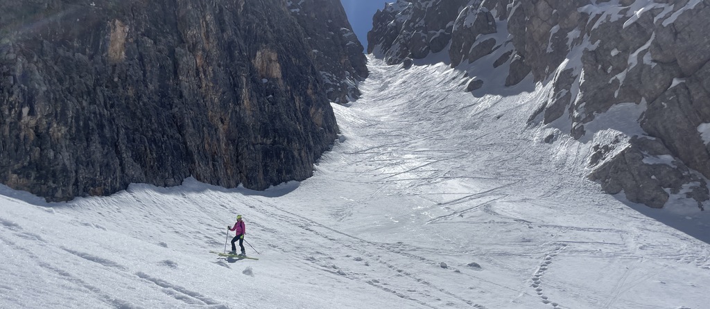 Il canale di discesa è spettacolare, incassato tra pareti rocciose e guglie affilate. La partenza è abbastanza stretta e ripida, ma da metà canale in poi le difficoltà diminuiscono regalando una discesa memorabile.