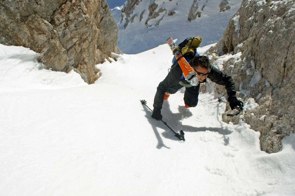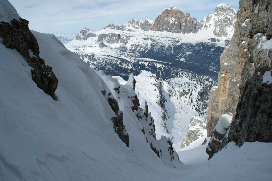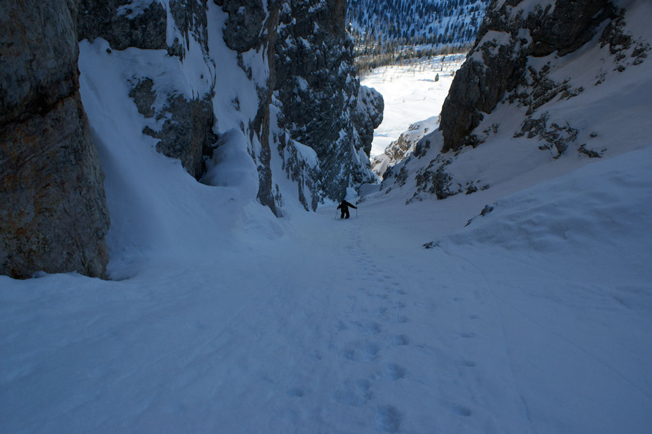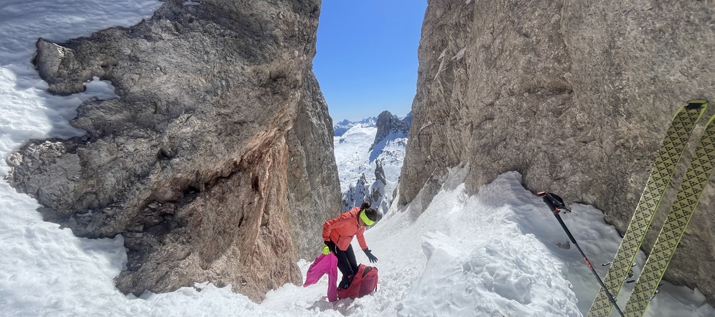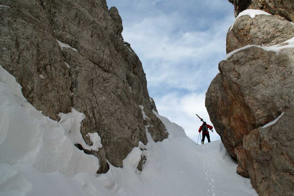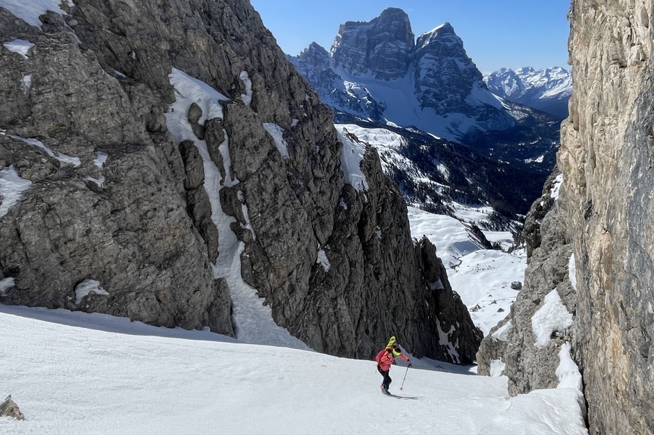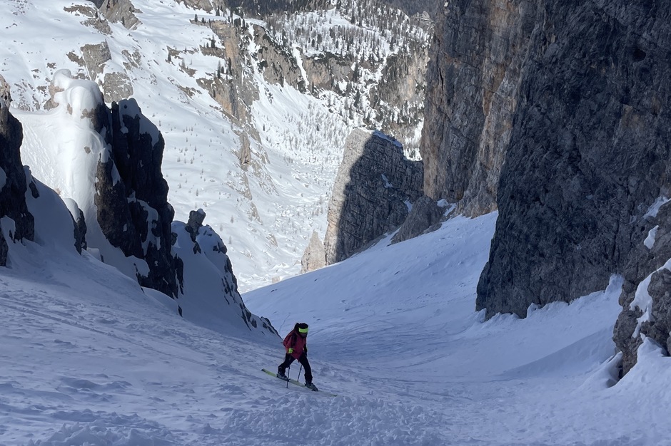 Il canale di discesa è spettacolare, incassato tra pareti rocciose e guglie affilate. La partenza è abbastanza stretta e ripida, ma da metà canale in poi le difficoltà diminuiscono regalando una discesa memorabile.