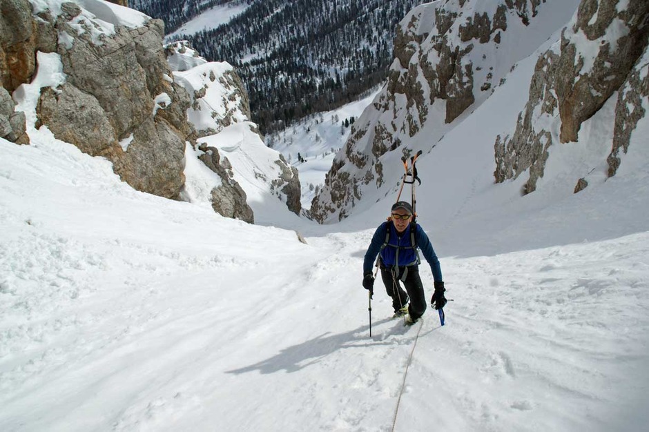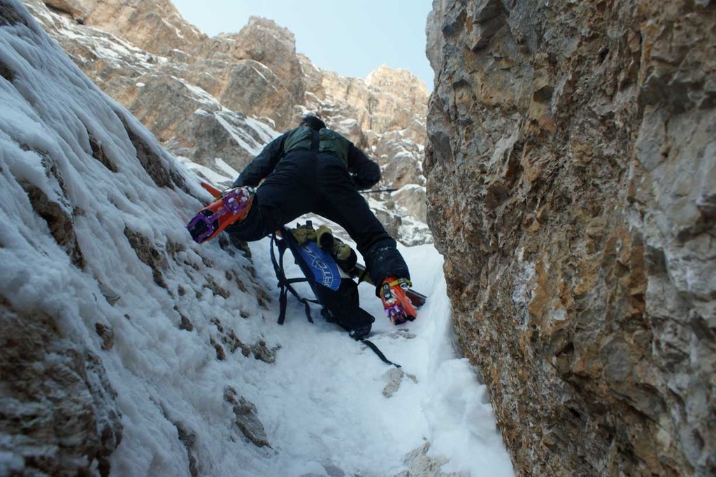 Calzati i ramponi e posti gli sci sullo zaino, si sale un serie di canali e cenge innervate, fino a raggiungere la sommità della Forcella Adì.