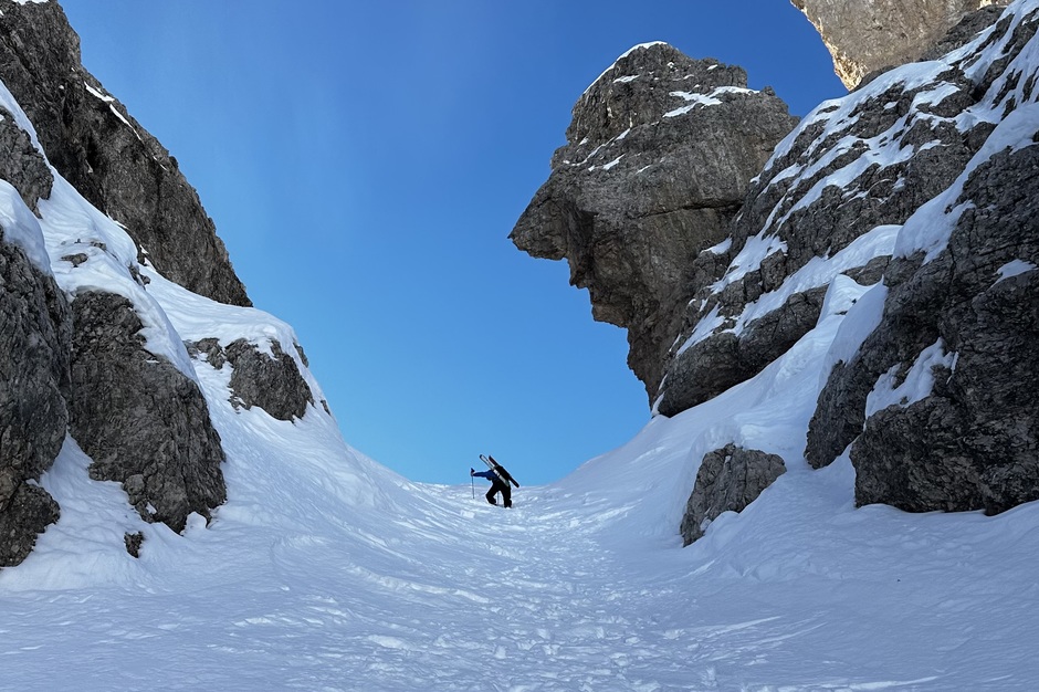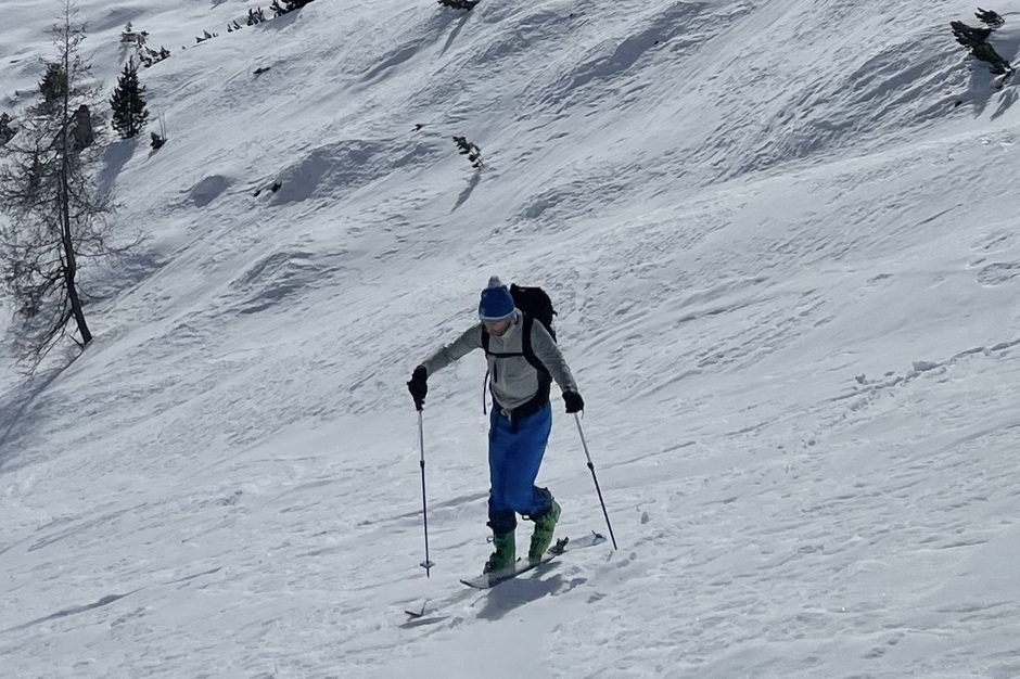 La discesa in parte segue li percorso di salita, ma in condizioni di un buon innevamento è possibile scendere per differenti pendii.