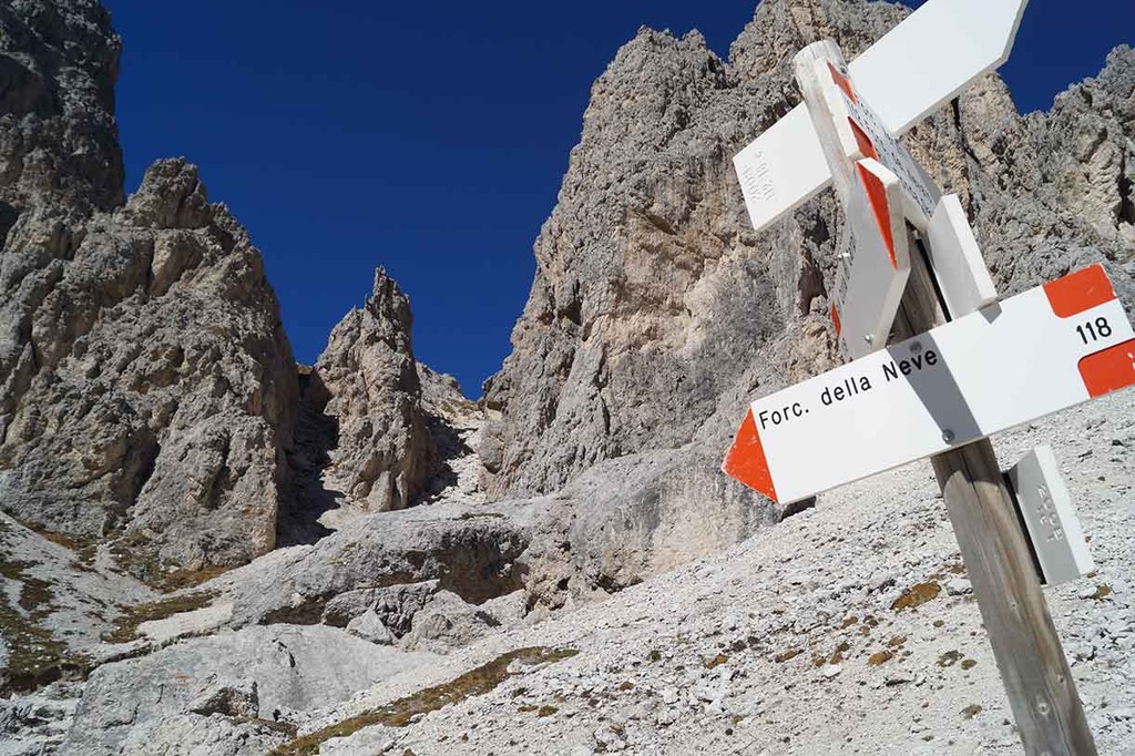 Con un lungo traverso, sempre per bel sentiero, si arriva alla base della forcella della Neve, passando sotto la spettacolare Torre Innerkofler. La salita alla forcella della Neve, 2471 metri, si sviluppa su terreno franoso senza seguire un sentiero segnato.