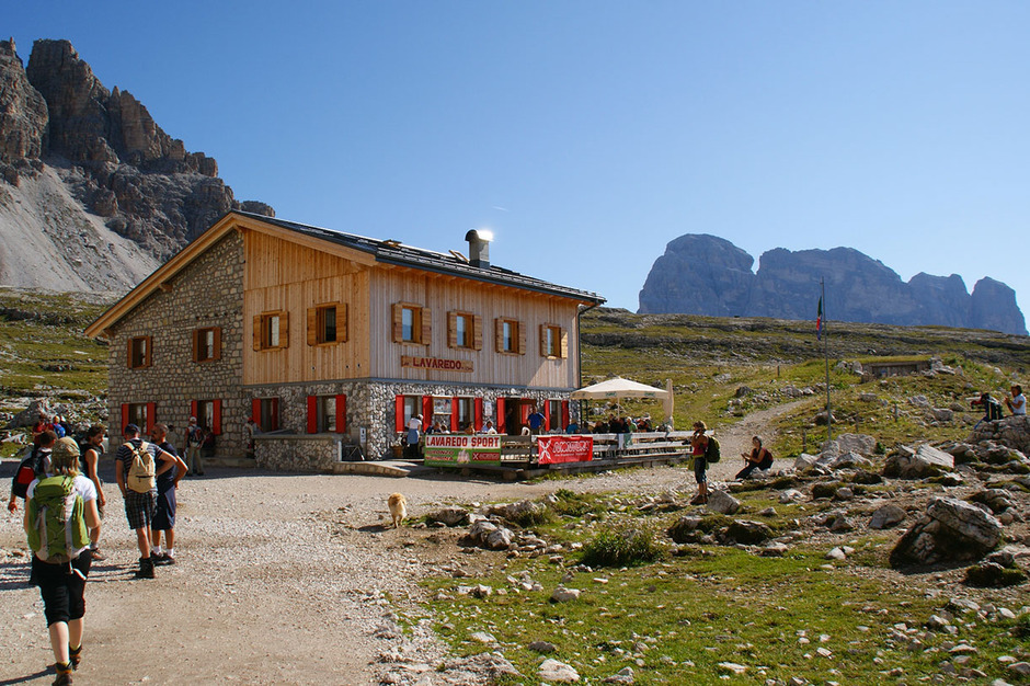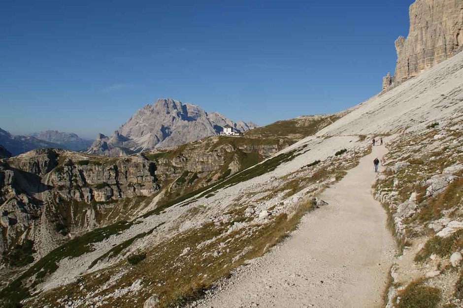 Seguendo ancora la bella stradina che ora costeggia il monte Paterno si giunge al rifugio Locatelli, spettacolare punto di osservazione delle Tre Cime di Lavaredo, che offrono una prospettiva incredibile.