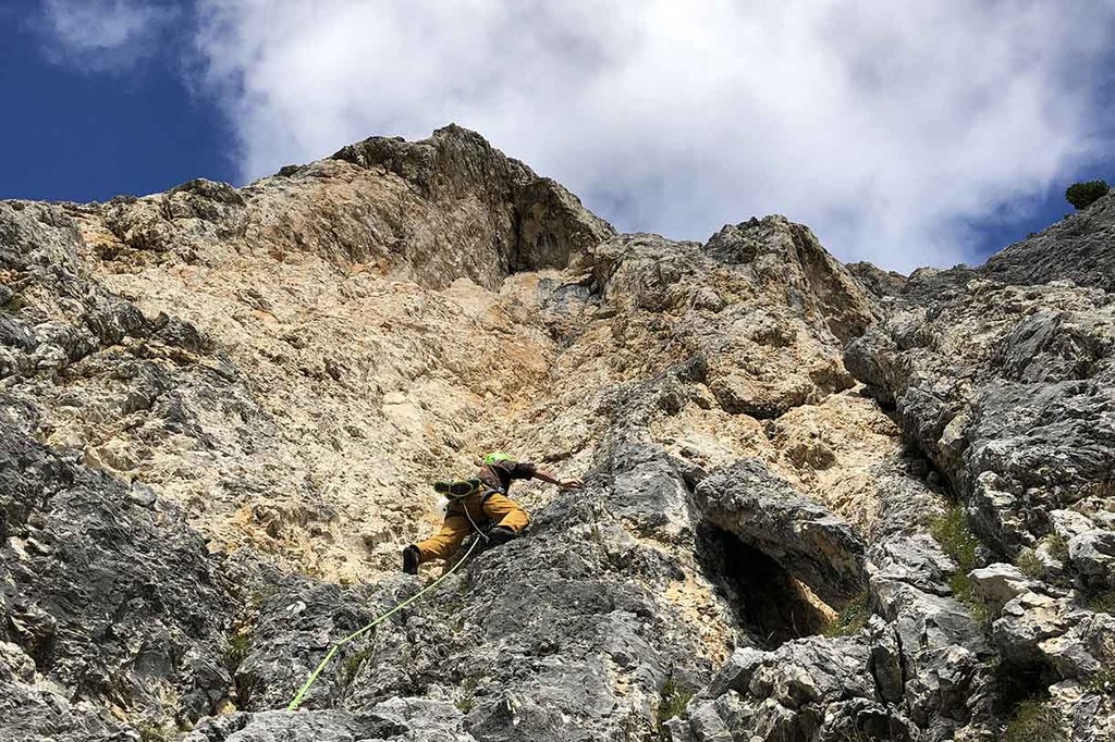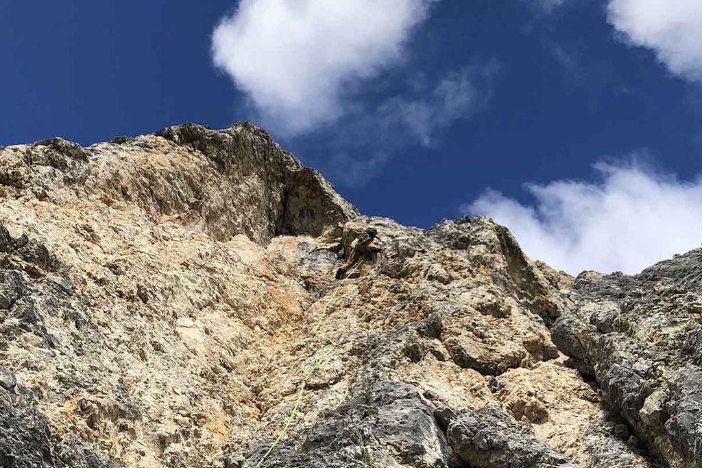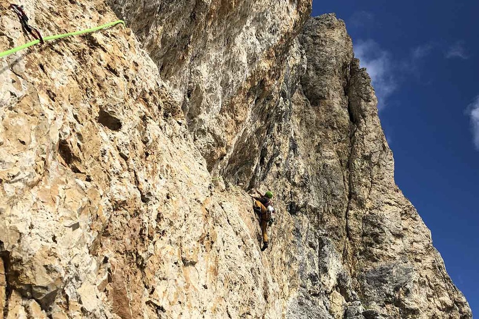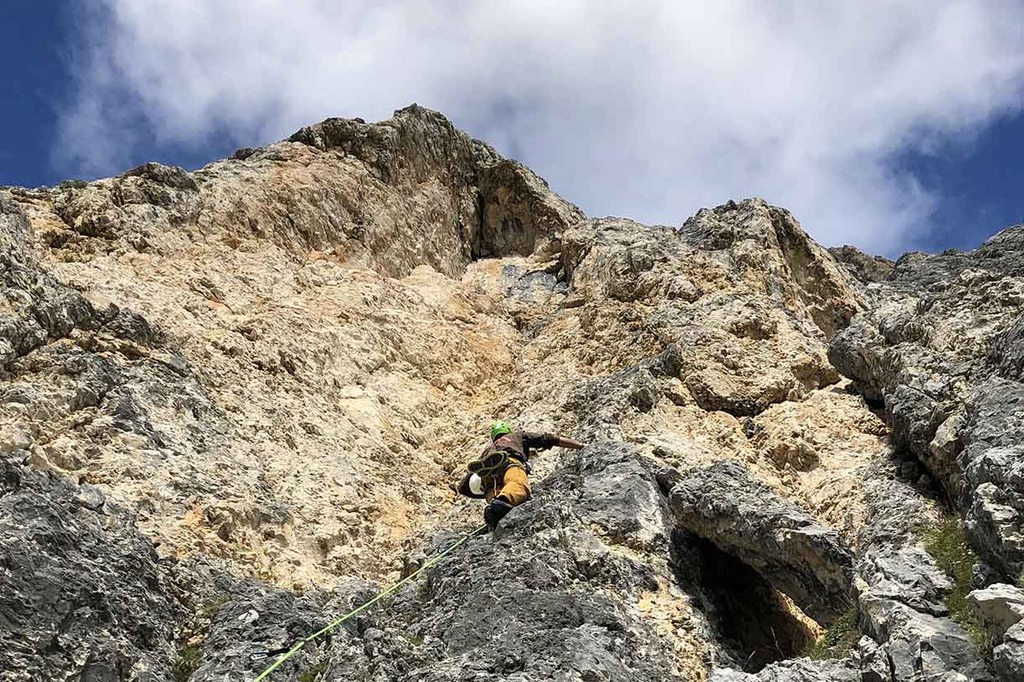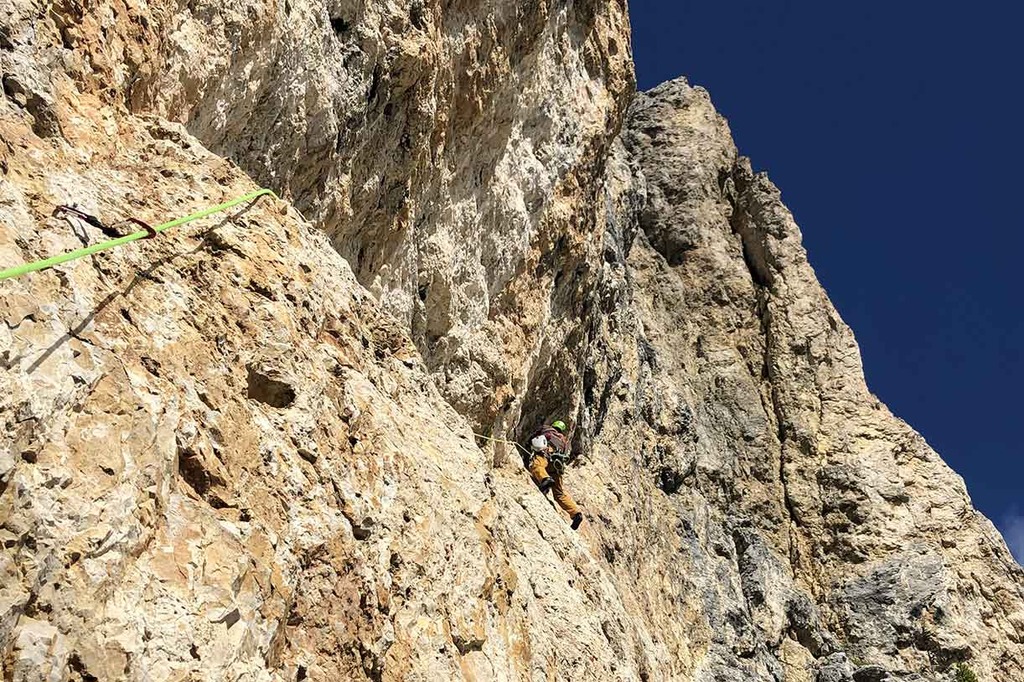 Dalla sosta si affronta un diedro giallo con arrampicata delicata per poi attraversare sulla desta e proseguire su roccia nera verticale con un passaggio alquanto impegnativo. Verso la fine del tiro attenzione a seguire gli spit fino alla sosta, non salire per il canale, roccia molto friabile!