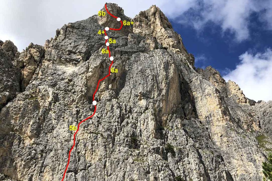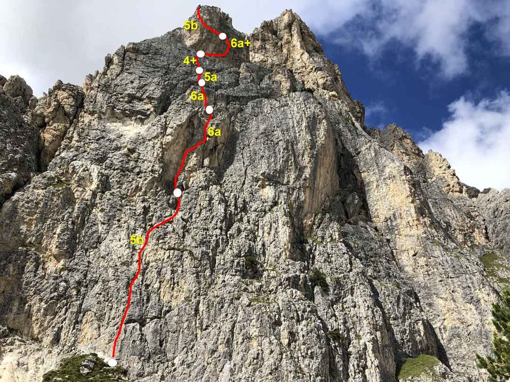 Salire dritti per placca grigia fino ad una piccola fessura su roccia gialla (chiodi cementati) poi leggermente a destra per facili roccie fino alla sosta.