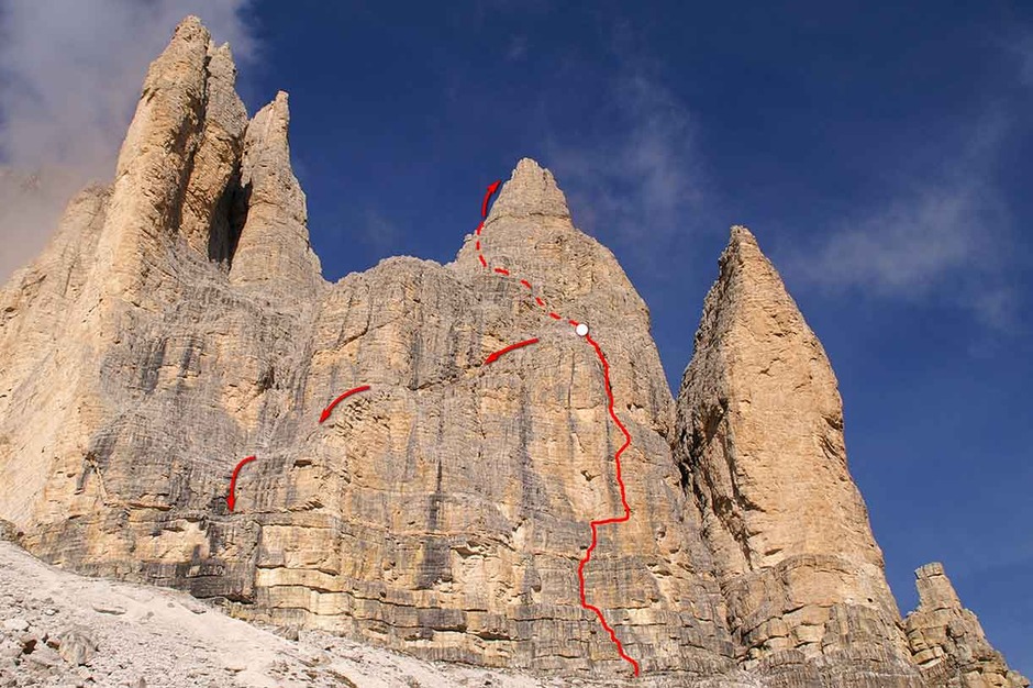 Il secondo e terzo tiro salgono per lo più verticali, fino a raggiungere un marcato diedro giallo e friabile che si evita con un'attraversata esposta verso destra.