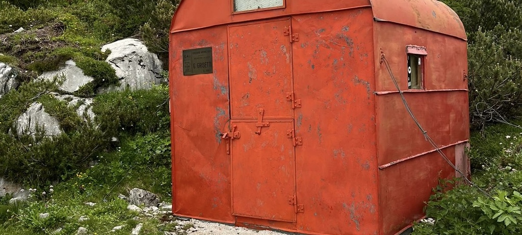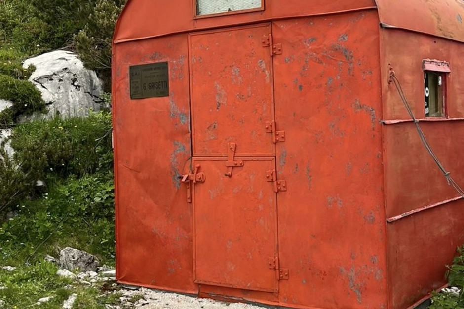 Raggiunto il rifugio in circa 45 minuti è possibile individuare l’attacco della ferrata grazie a un grosso quadrato rosso dipinto sulla parete.