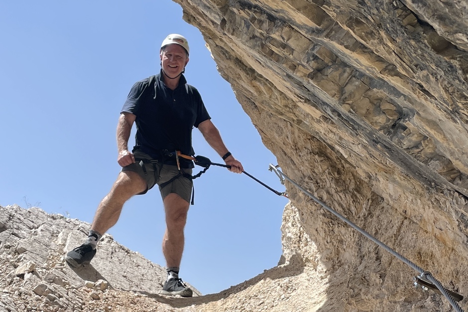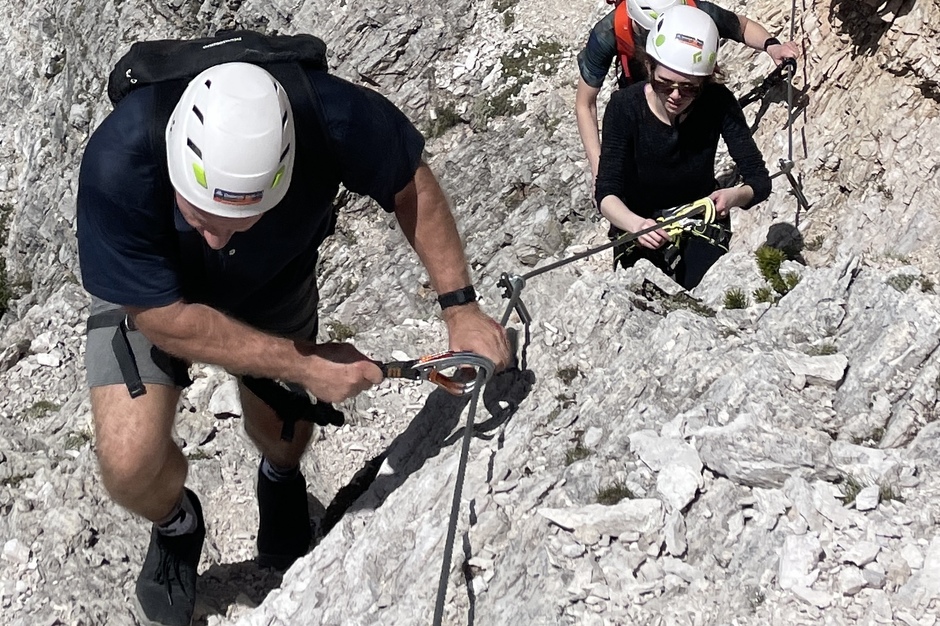 Il primo tratto di ferrata in obliquo verso sinistra parte già bello tecnico e impegnativo, con pochi appoggi per i piedi .