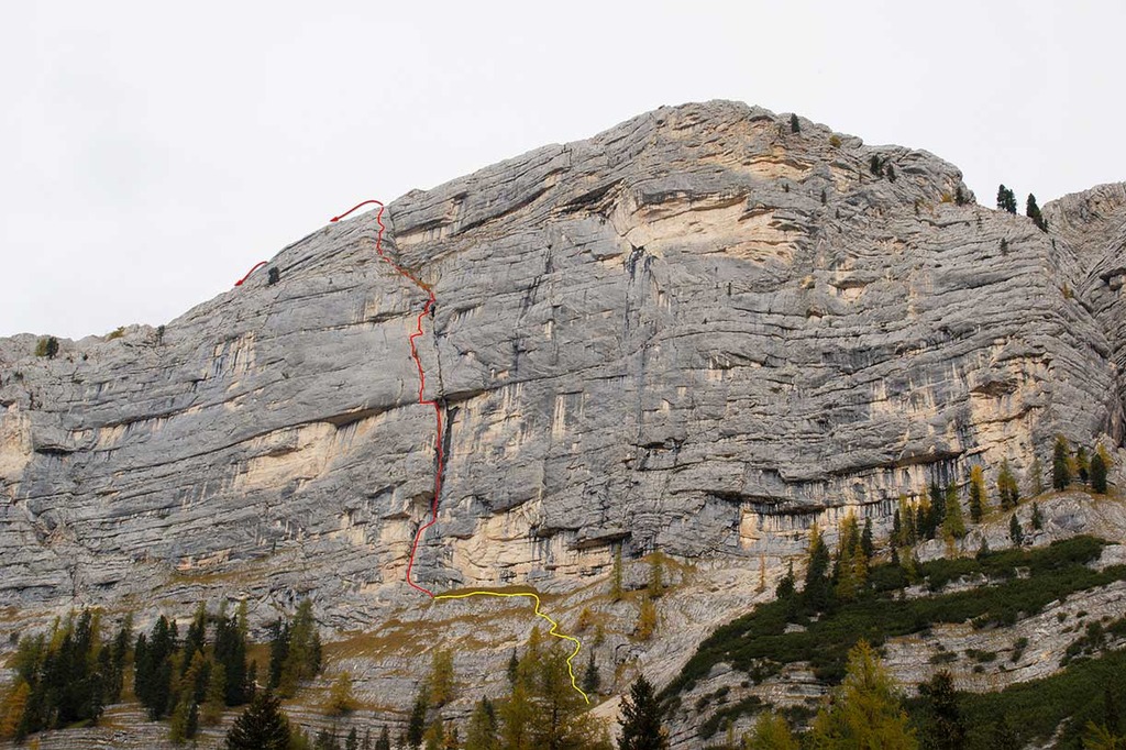 La via ha una logicità esemplare lungo un marcato diedero che sale dritto fino a metà parete, poi per fessure e placche fino alla sommità.