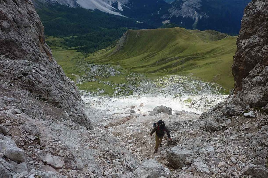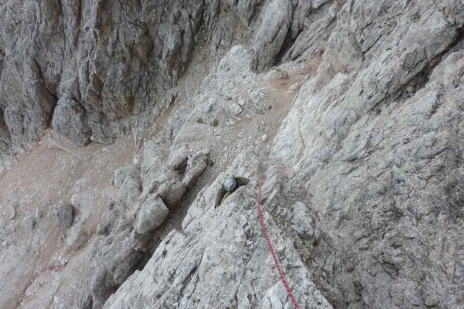 La discesa si effettua per la via di salita facendo anche delle calate su catene a corda doppia.