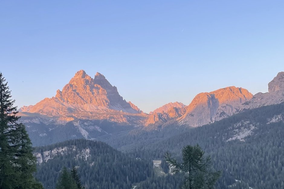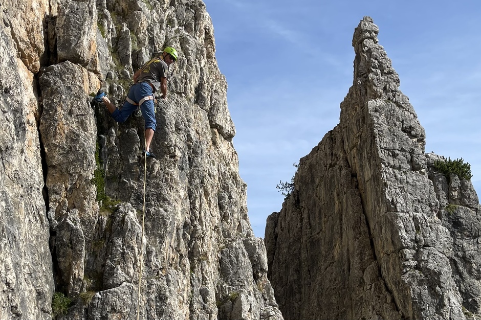 La mattina, dopo aver assistito al sorgere del sole dietro le cime dolomitiche e aver fatto colazione, abbiamo arrampicato al sole lungo una bella via alpinistica di 4 grado. Un' avventura che sicuramente ricorderemo a lungo.