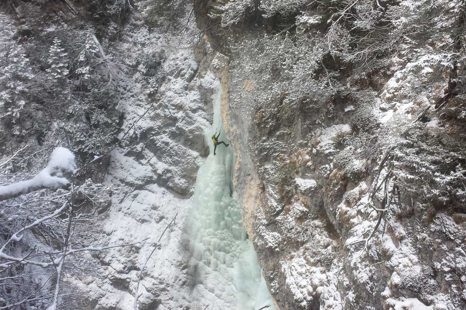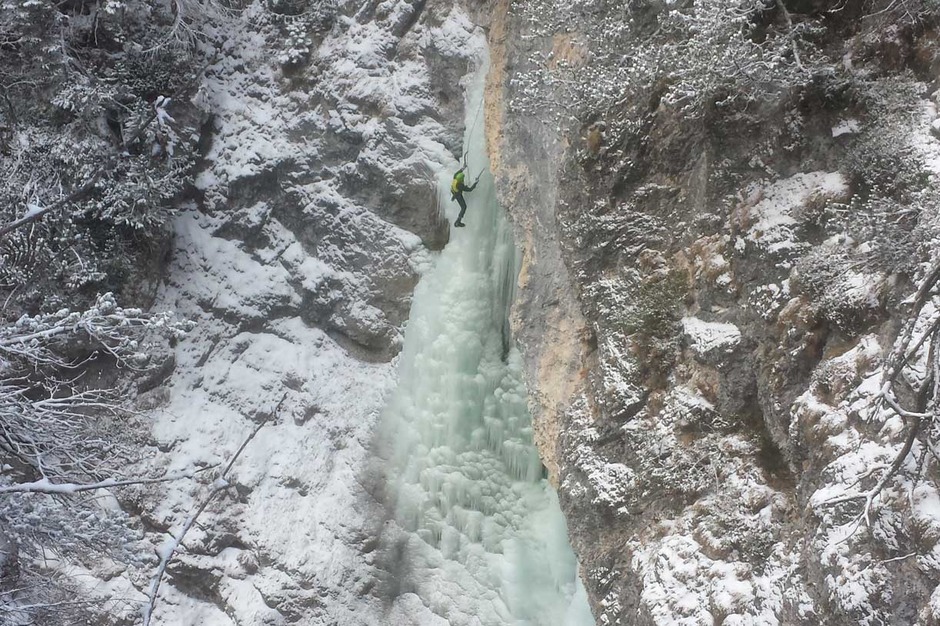 In un ambiente meraviglioso, un interessante itinerario di arrampicata su ghiaccio, di circa 50 metri, facilmente accessibile e proteggibile dall'alto.