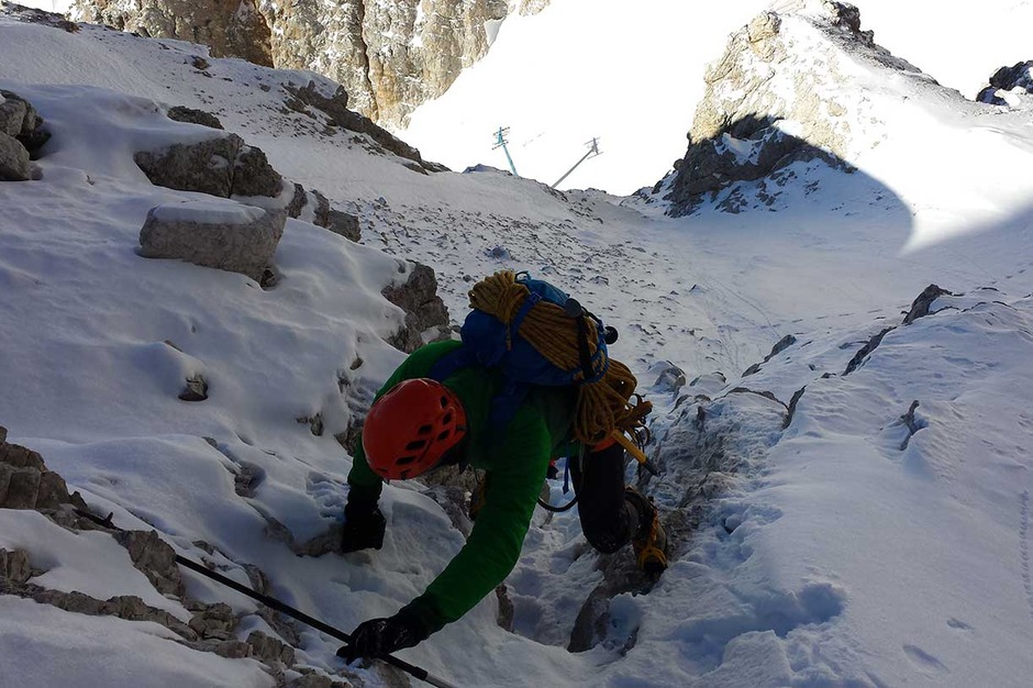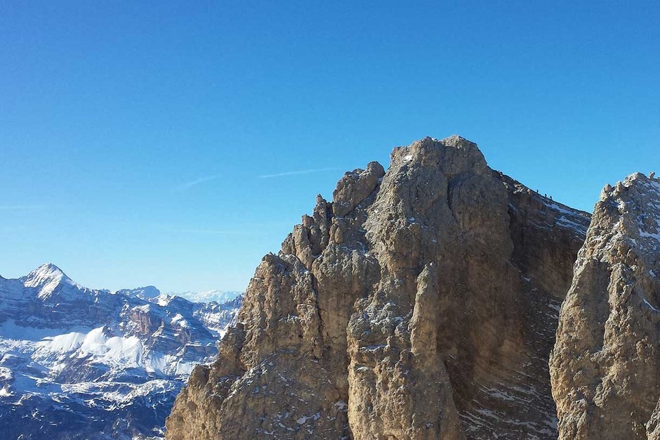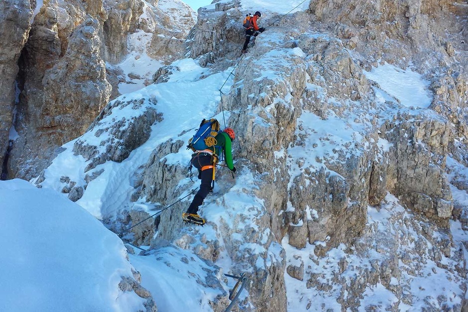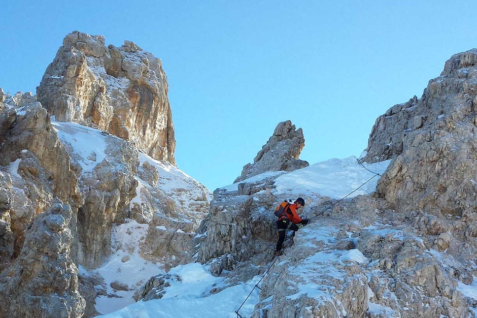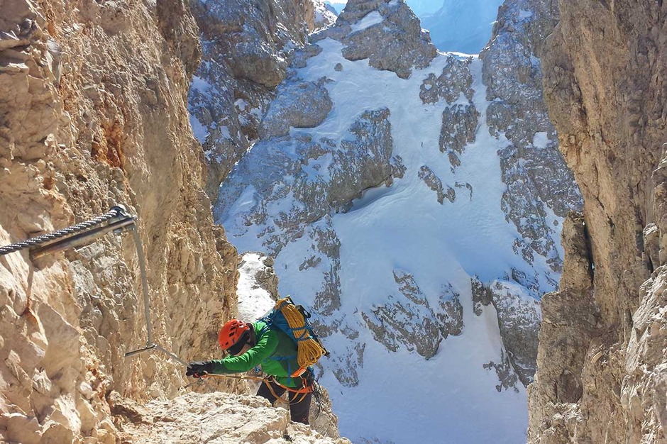 Dalla forcella si può proseguire a destra lungo la via Ferrata Marino Bianchi o dirigersi verso sinistra lungo la stessa, fino al Rifugio Lorenzi.