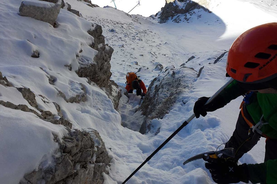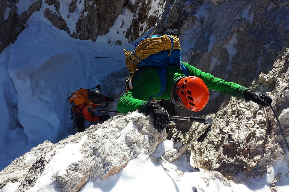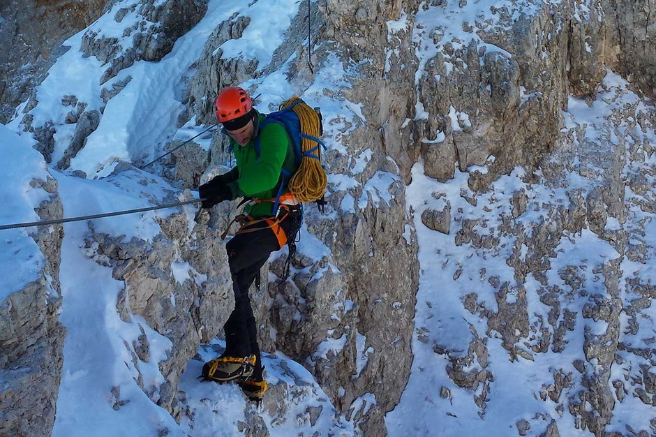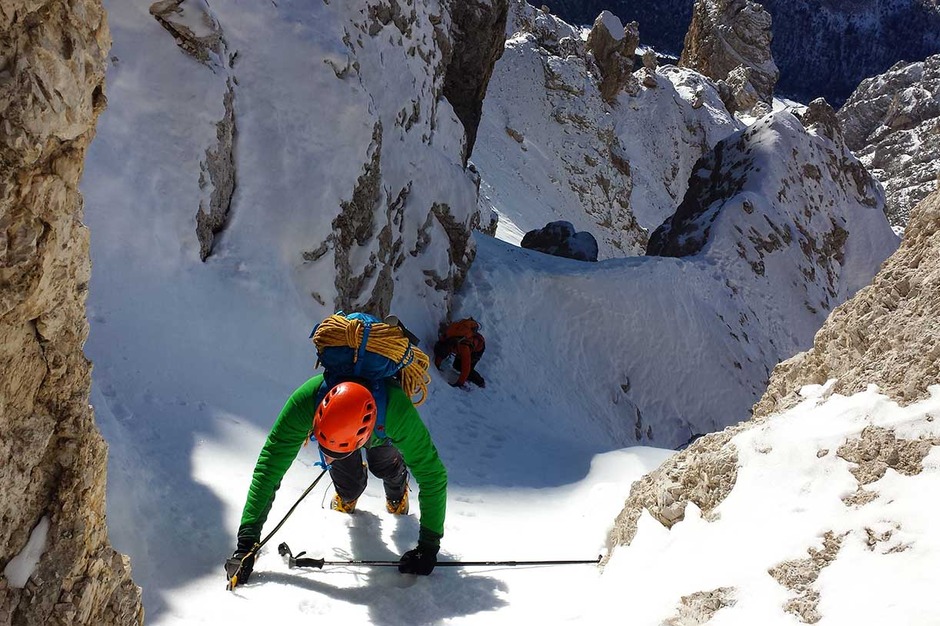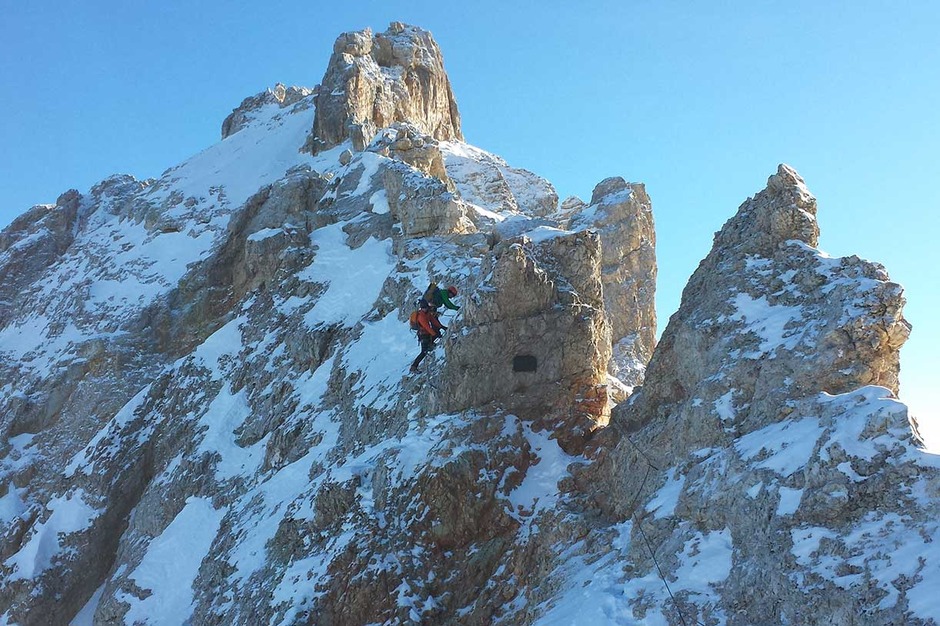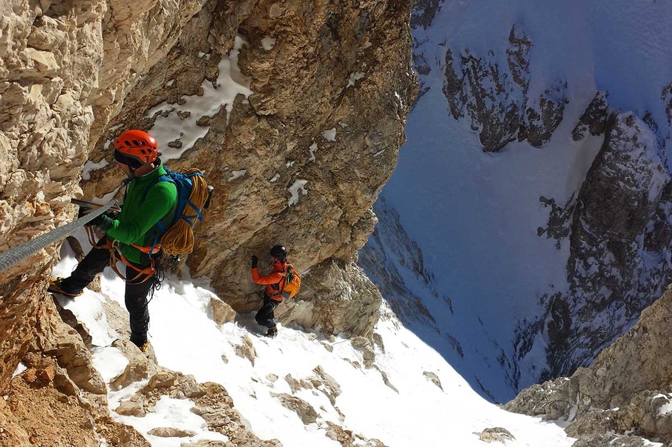 Dalla forcella si può proseguire a destra lungo la via Ferrata Marino Bianchi o dirigersi verso sinistra lungo la stessa, fino al Rifugio Lorenzi.