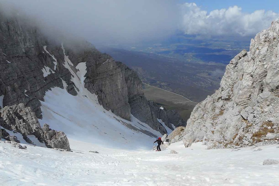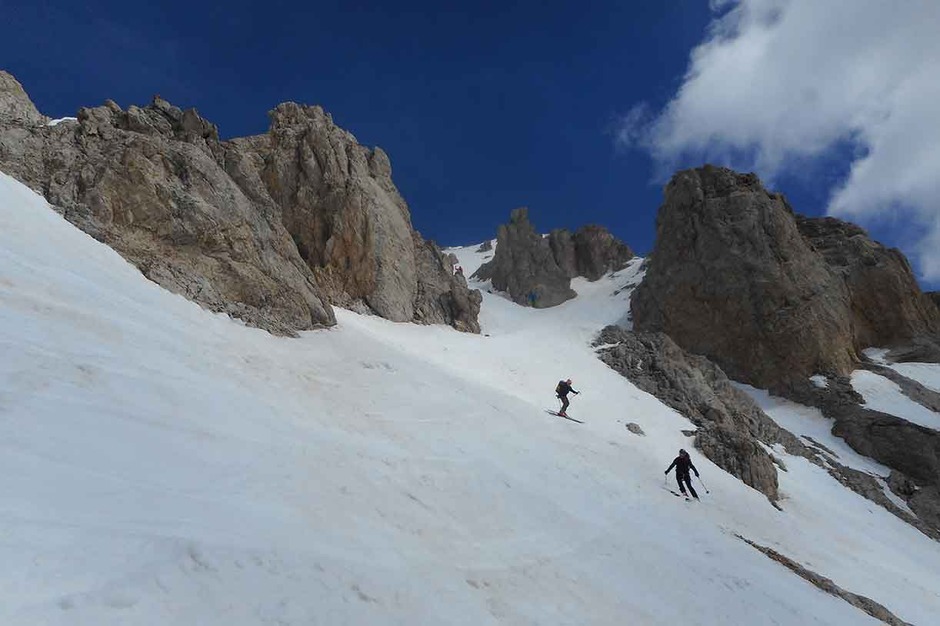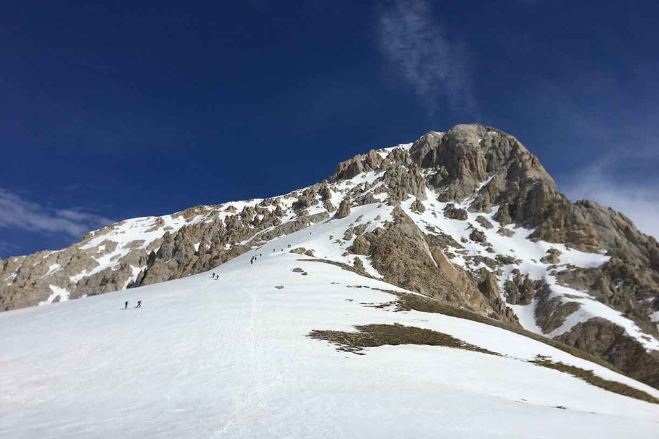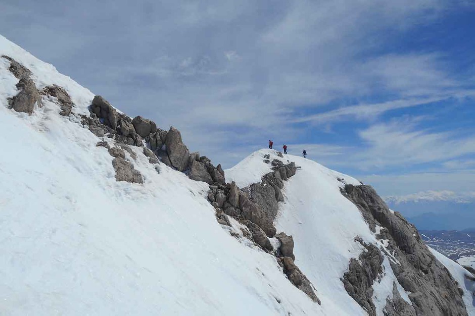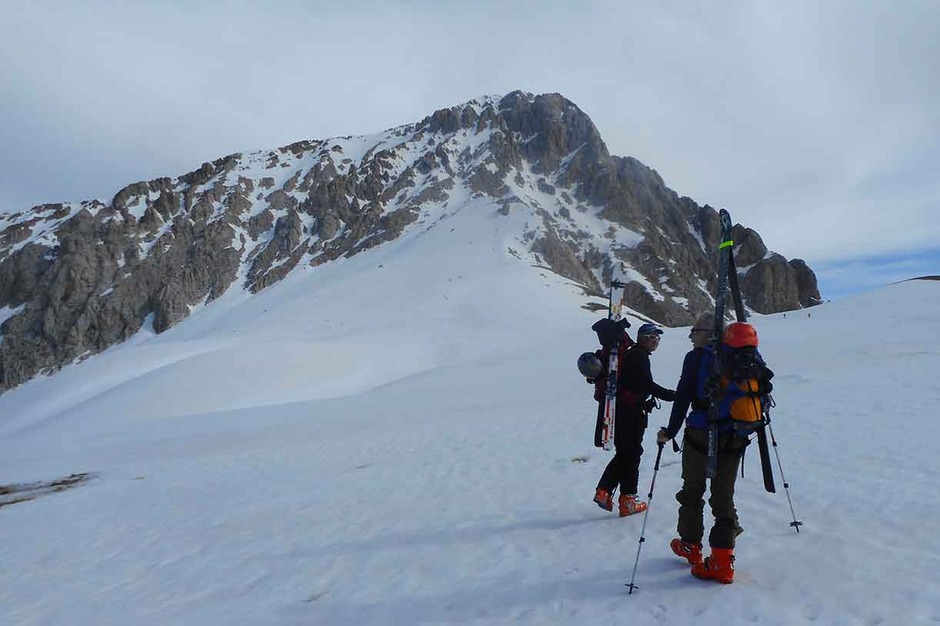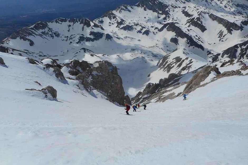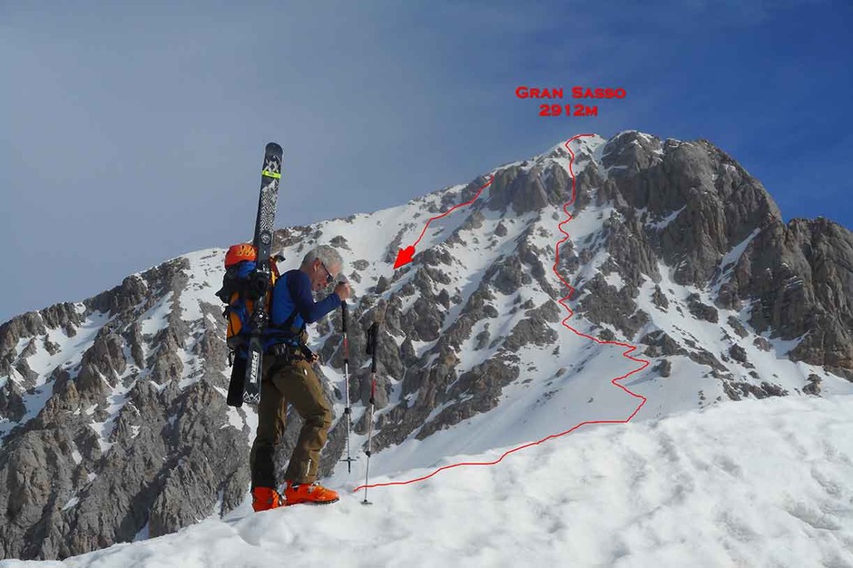 Il primo giorno del tour di sci alpinismo in Abruzzo, il gruppo ha affrontato la salita alla Cima del Gran Sasso lungo la via direttissima sud. Un itinerario non banale che si sviluppa lungo dei canalini ripidi fino ai 50 gradi, da affrontare con piccozza e ramponi. Dalla cima del Gran Sasso, a 2912 metri, si gode di un magnifico panorama e si vede molto bene il mare Adriatico. La discesa, direttamente lungo il pendio Bissolati, con pendenza media di 40 gradi, con neve perfetta, ha dato una grande soddisfazione ai partecipandi l'escursione.