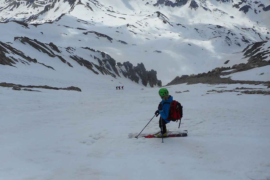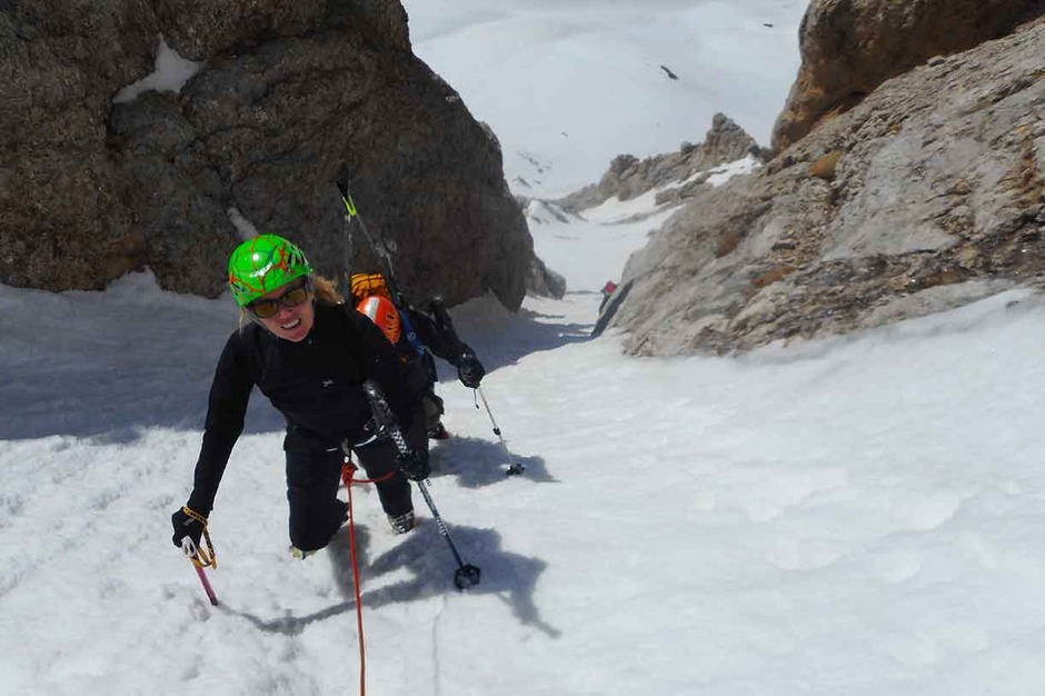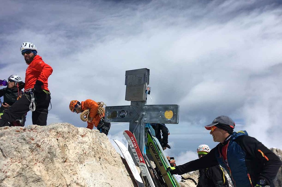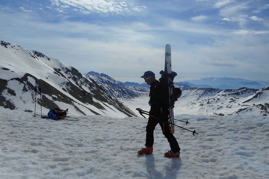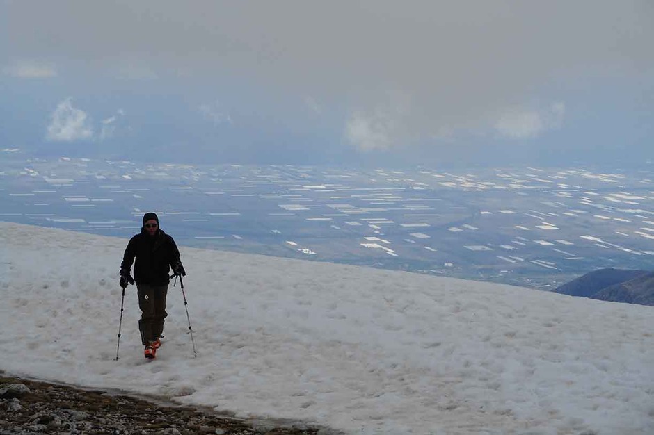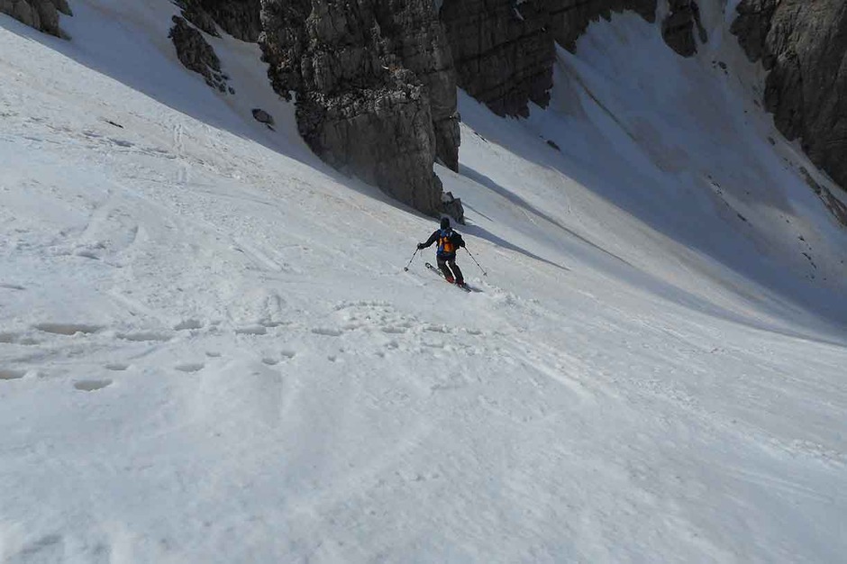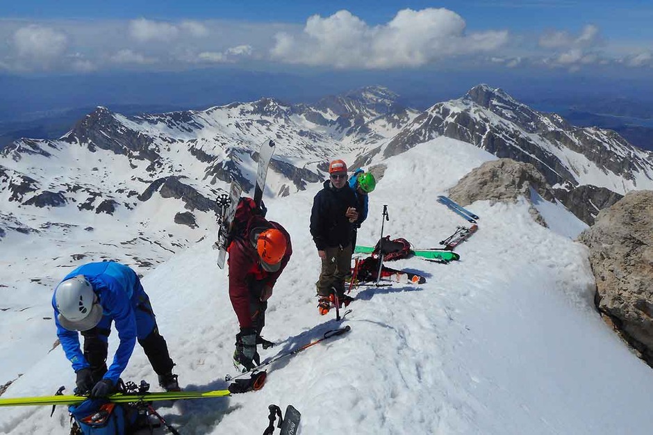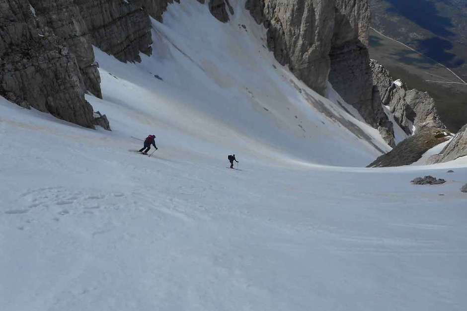 Il primo giorno del tour di sci alpinismo in Abruzzo, il gruppo ha affrontato la salita alla Cima del Gran Sasso lungo la via direttissima sud. Un itinerario non banale che si sviluppa lungo dei canalini ripidi fino ai 50 gradi, da affrontare con piccozza e ramponi. Dalla cima del Gran Sasso, a 2912 metri, si gode di un magnifico panorama e si vede molto bene il mare Adriatico. La discesa, direttamente lungo il pendio Bissolati, con pendenza media di 40 gradi, con neve perfetta, ha dato una grande soddisfazione ai partecipandi l'escursione.