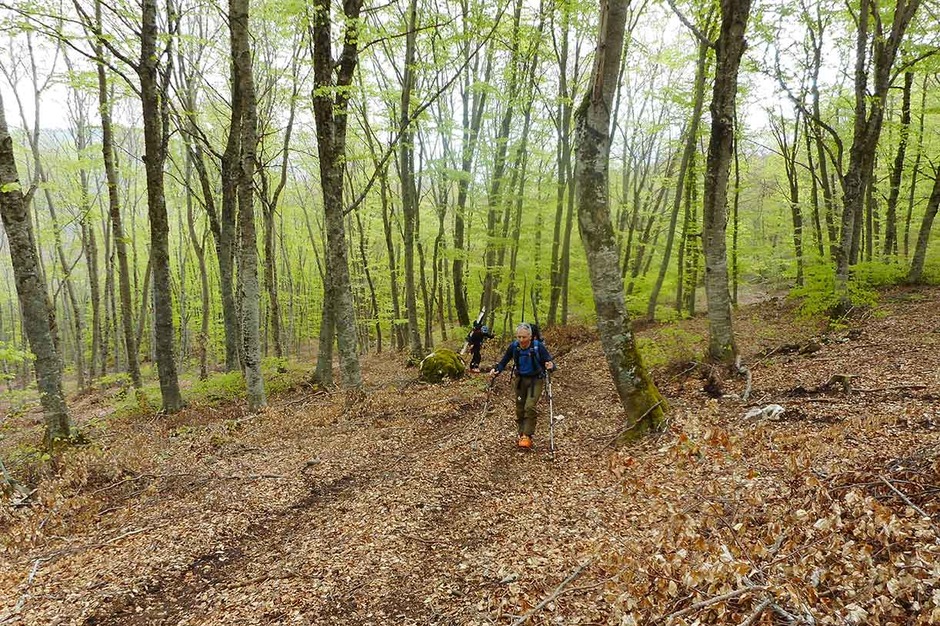 Anche il secondo giorno del tour di sci alpinismo in Abruzzo è stato molto interessante con la salita al Monte Sirente, lungo un grande vallone che sale fino ad una forcella, per proseguire poi per cresta fino alla cima a 2349 metri di altezza. Particolarmente suggestivo è stato l’avvicinamento al vallone, effettuato a piedi, attraverso un bellissimo bosco di faggio, pieno di fiori di mughetto nel sottobosco.