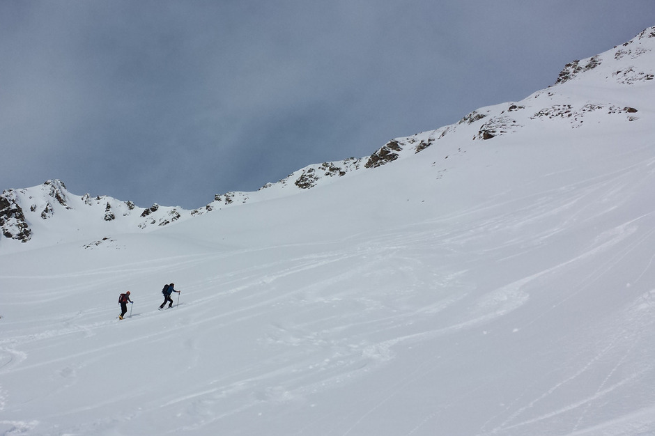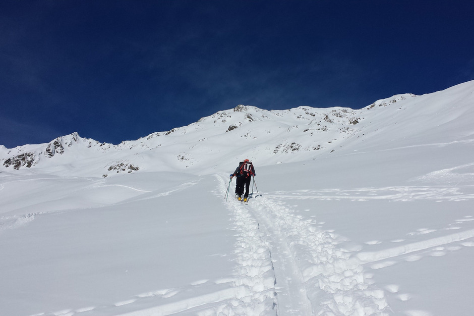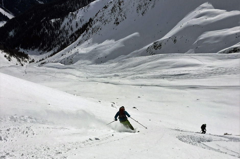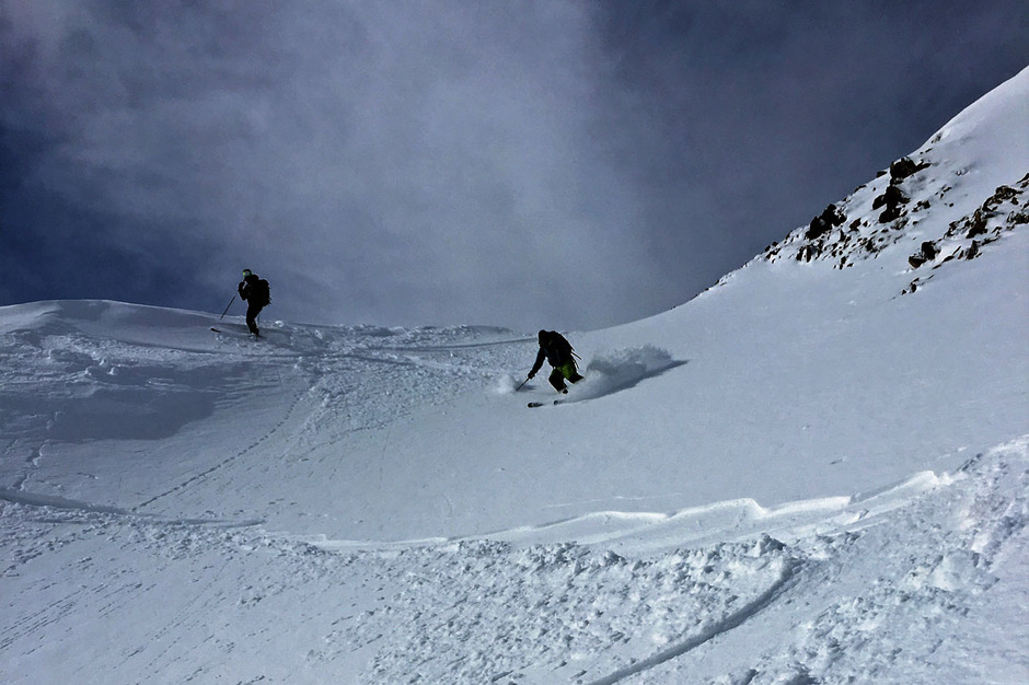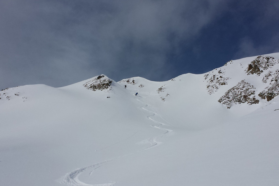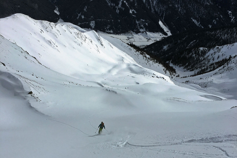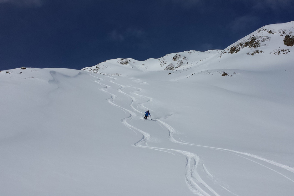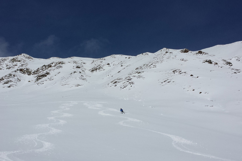 Dalla vetta si scende con una bella sciata freeride lungo la vallata di salita.