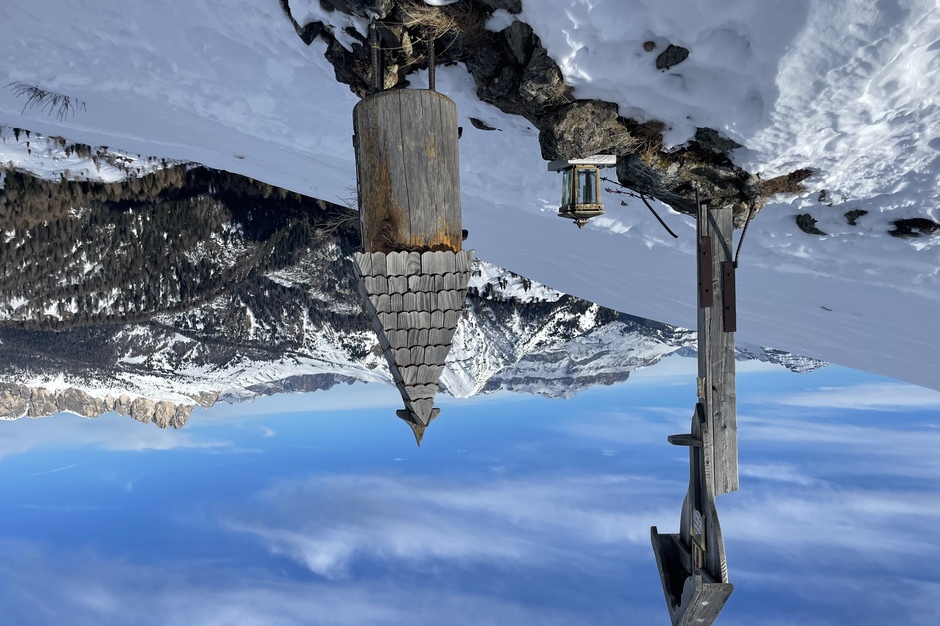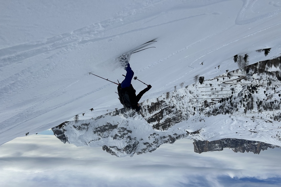 Visto la bella neve e la stabilità del manto nevoso siamo scesi lungo il ripido versante nord fino a raggiungere delle piccole casette private in legno.