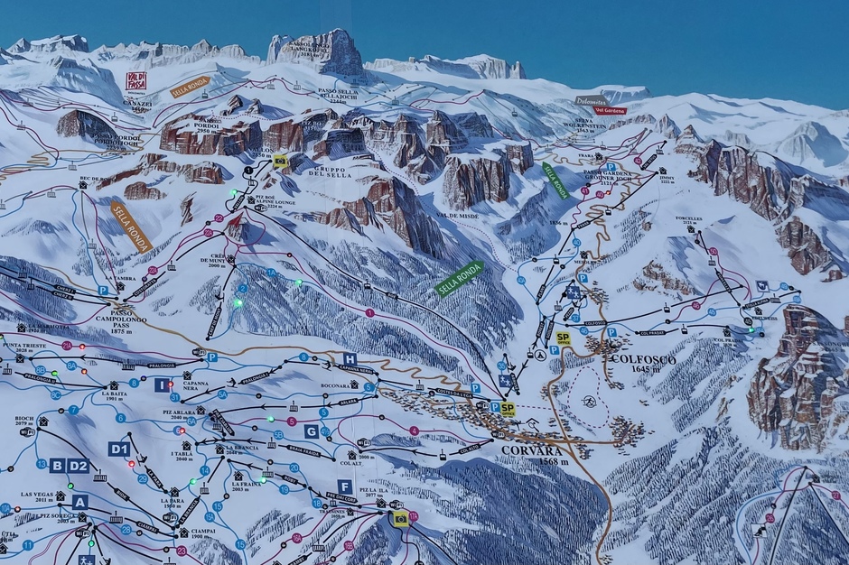 Lungo il percorso ad anello si attraversano ben 4 passi dolomitici; passo Ciampolongo, passo Pordoi, passo Sella e passo Gardena. Le piste sono di livello blu e rosso mai troppo difficili e pendenti rendendo una piacevole e trancuilla sciata. Da non perdere sono i rifugi distribuiti lungo le piste da sci che offrono una cucina locale molto buona e particolare .