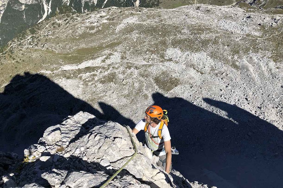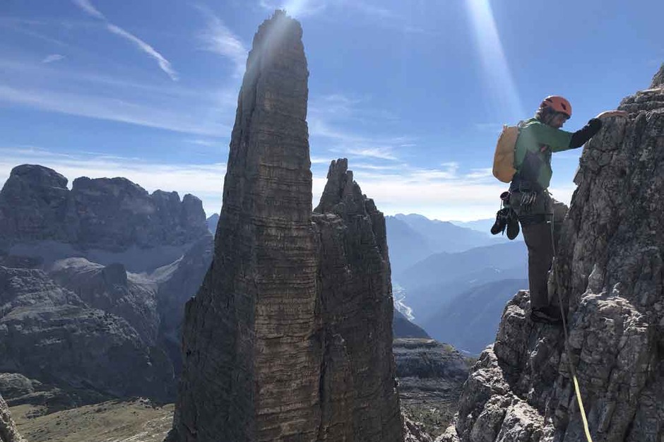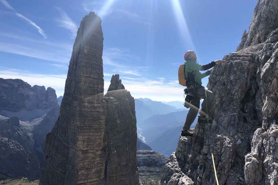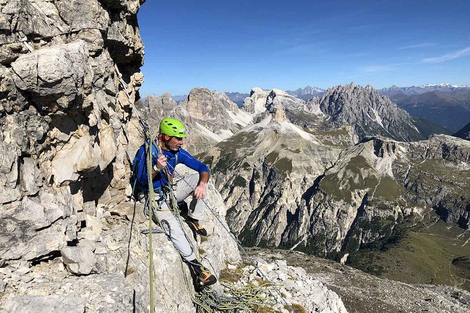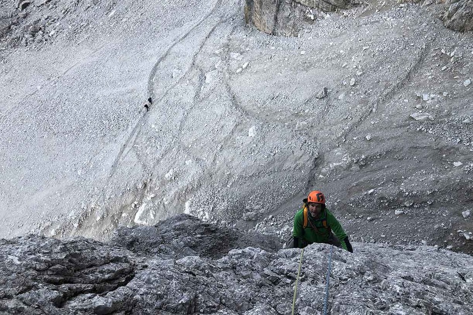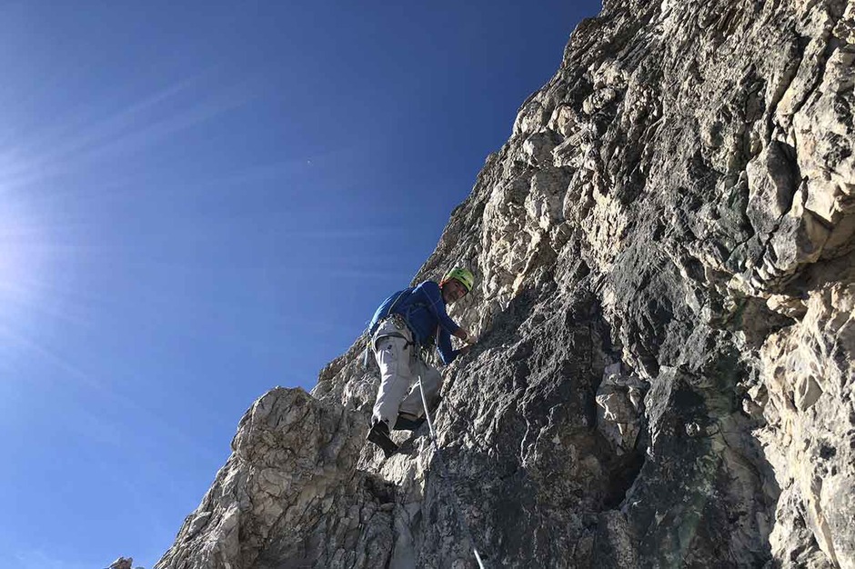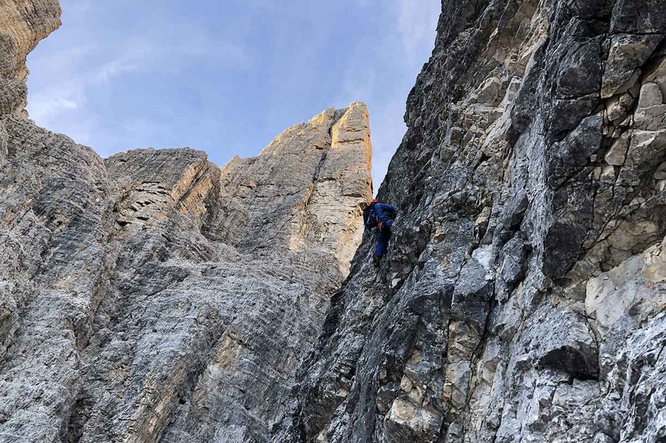 La nostra ammirazione mentre saliamo è dedicata ad Angelo Dibona, un mio lontano parente che con soli 5 chiodi, un martello e una corda di canapa, nel 1909 salì questa parete. Un alpinista lasciato un po' in ombra senza aver riscontrato quella notorietà che avrebbe meritato. Chi lo conosceva diceva che era un fuoriclasse dell'arrampicata, saliva slegato sul 5 grado e scendeva faccia a valle sul 4 grado! Reinhold Messner gli ha dedica una intera parete di fotografie nel suo museo del Monte Rite.