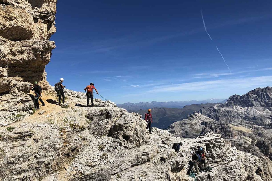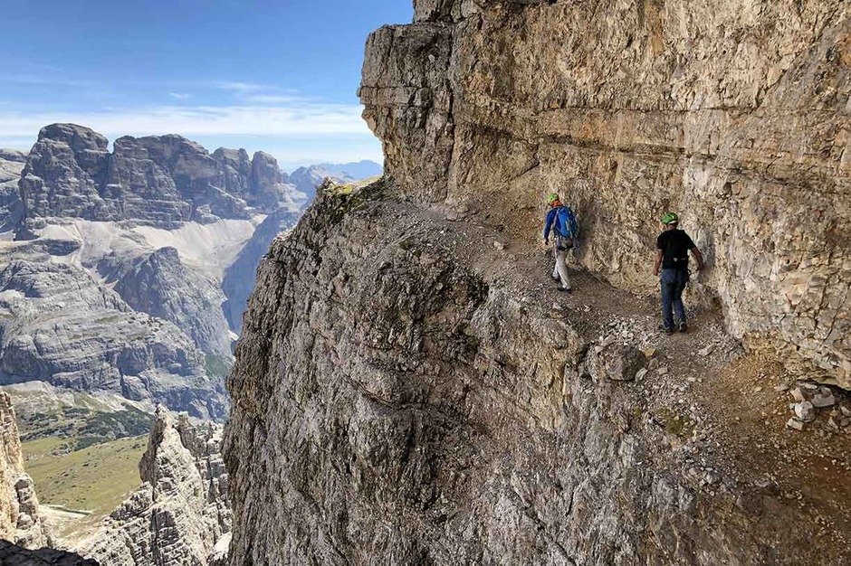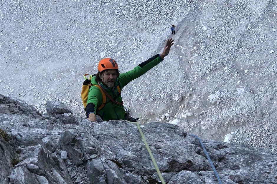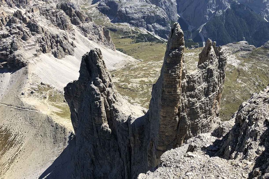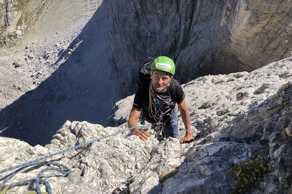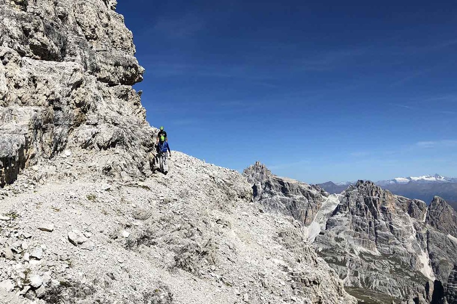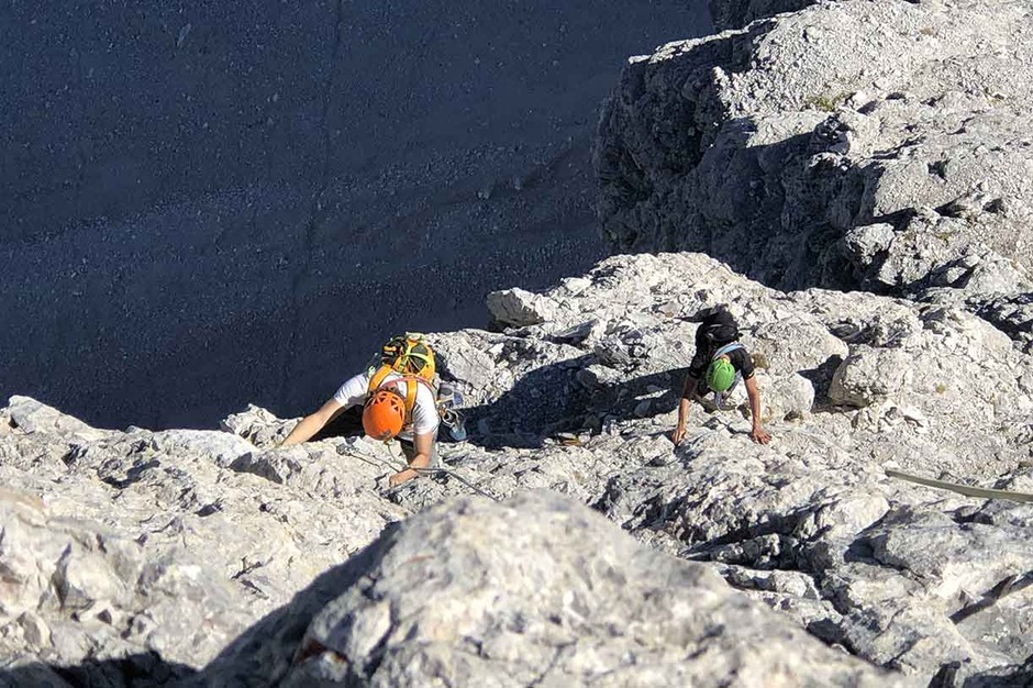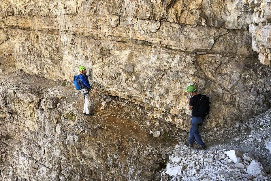La nostra ammirazione mentre saliamo è dedicata ad Angelo Dibona, un mio lontano parente che con soli 5 chiodi, un martello e una corda di canapa, nel 1909 salì questa parete. Un alpinista lasciato un po' in ombra senza aver riscontrato quella notorietà che avrebbe meritato. Chi lo conosceva diceva che era un fuoriclasse dell'arrampicata, saliva slegato sul 5 grado e scendeva faccia a valle sul 4 grado! Reinhold Messner gli ha dedica una intera parete di fotografie nel suo museo del Monte Rite.