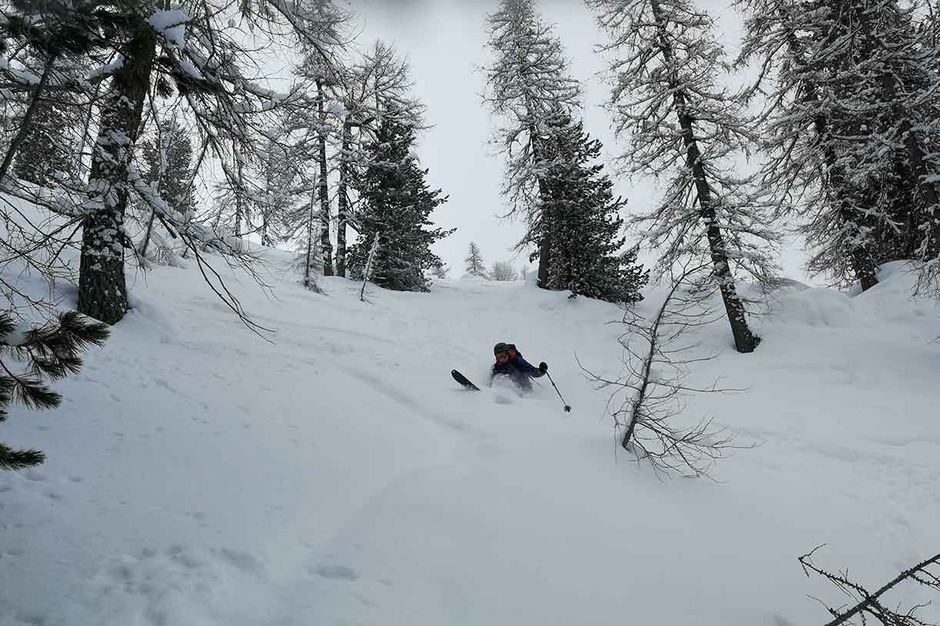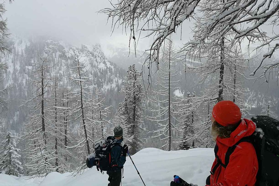 Il terzo giorno si sono spostati ai Cadini di Misurina per salire la Forcella Pogoffa e la Forcella della Neve, dove hanno trovato 40 centimetri di neve fresca per una fantastica sciata in fuoripista.